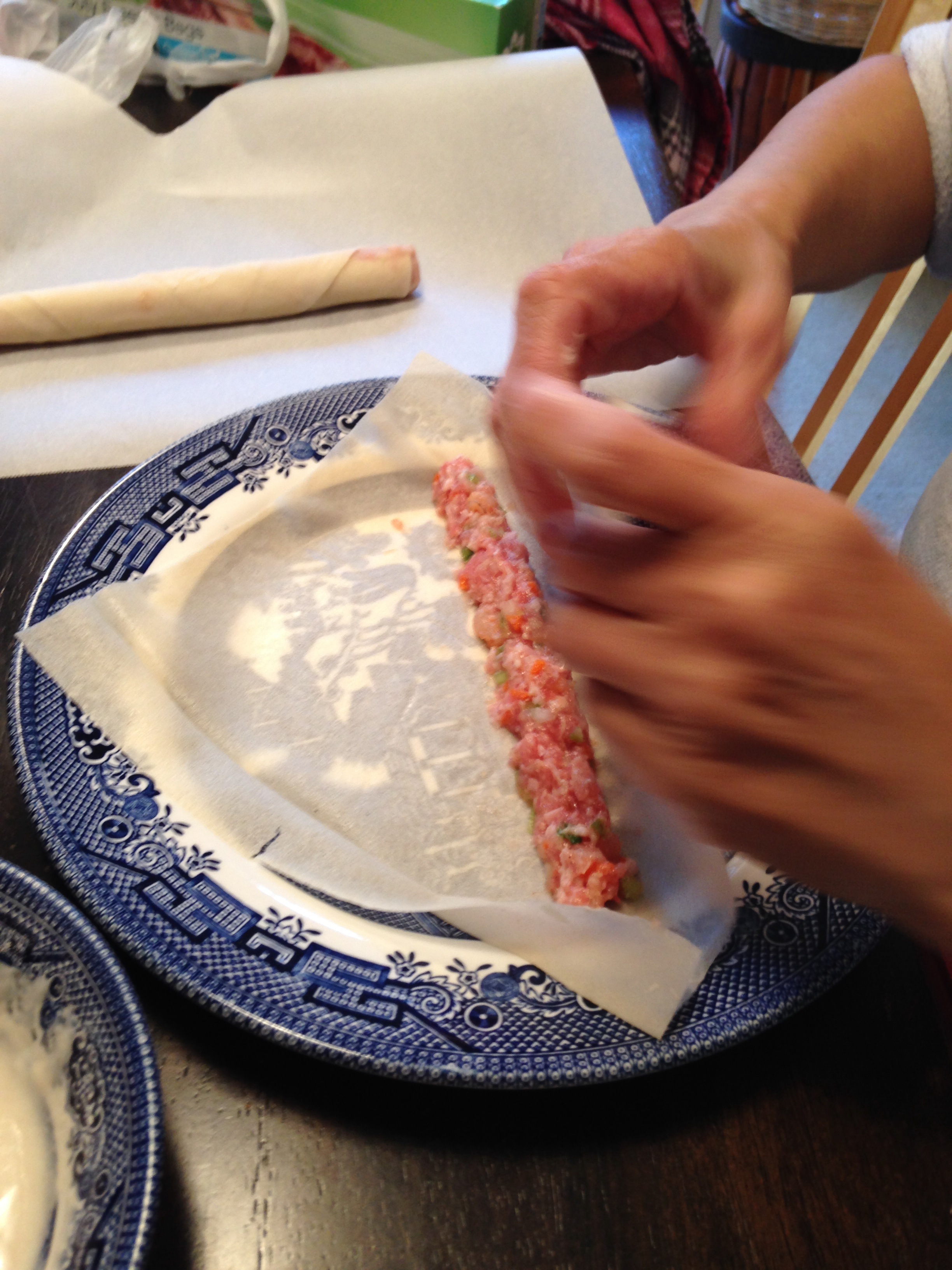 My mom starts to show me how. Can you slow down please, and give me a step-by-step? Okay, place your wrapper on your plate like a diamond. Take a full tablespoon of mixture and place in the center, thin out side to side. (I am reminded it needs to be thin because it’s raw meat and needs to be fully cooked. Mom also says that some people pre-cook the meat, but it really just isn’t as good.) Fold bottom over meat and tuck in tightly. Roll once. Fold each side to center. Roll one time. Apply paste to edges of remaining wrapper. Continue to roll – tightly – until pointy tip is centered, apply paste to tip if needed.
