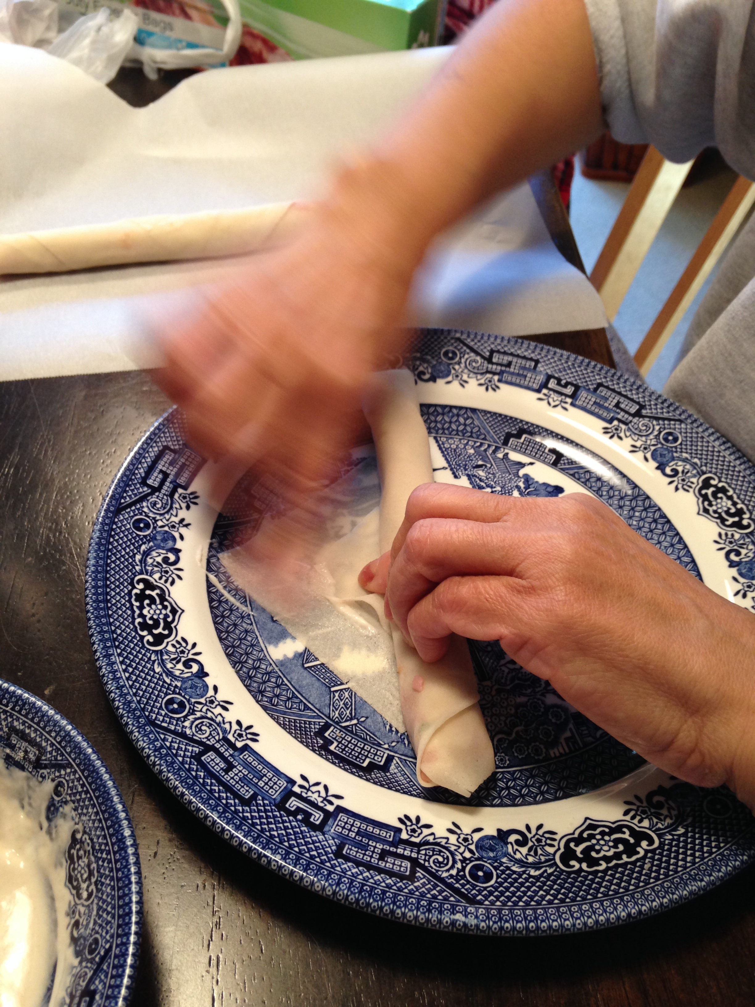 Lita’s delicate nimble hands make quick work of the task laid before us – rolling lumpia.