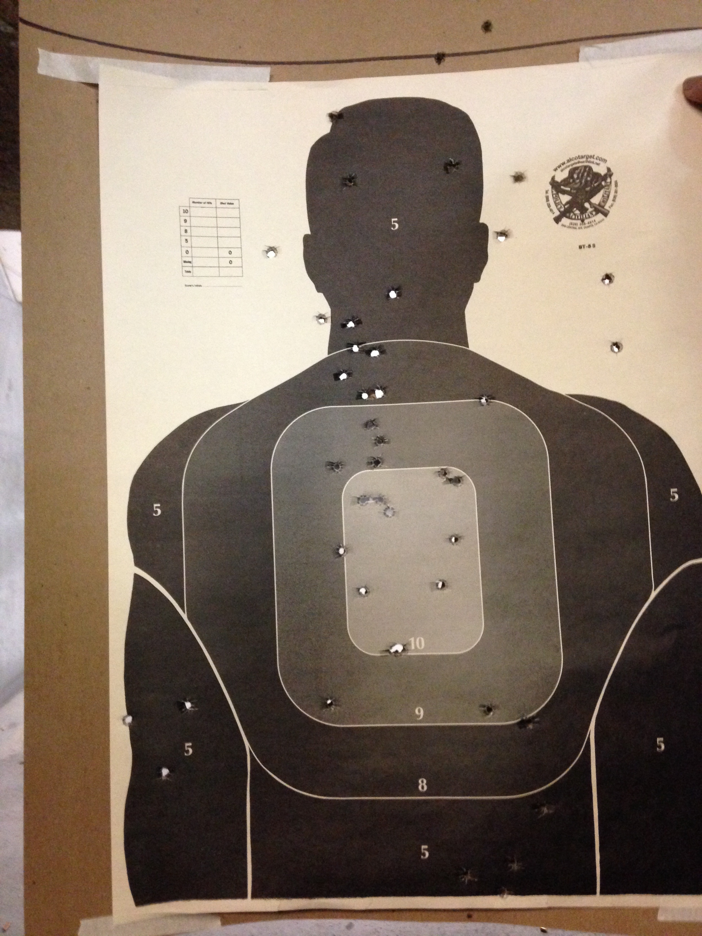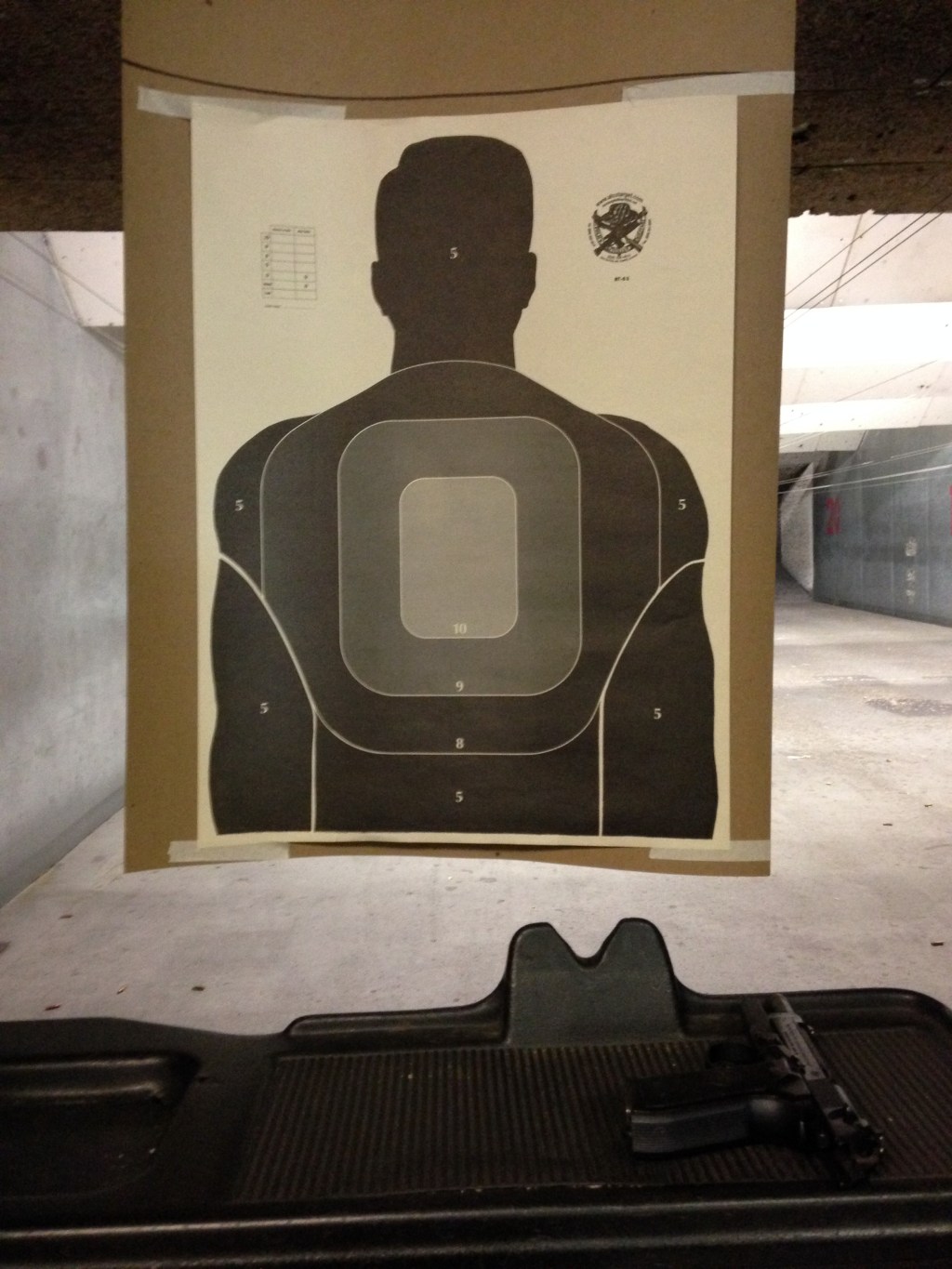 My turn. Okay, I can do this. So I hold the gun out, with both my arms extended out, legs slightly apart for steadiness (I’ve watched a few police-type TV shows). I aim. I lightly put my finger on the trigger, what am I waiting for…and BOOM! Wow! I wasn’t expecting that kick. So I shoot again. More kick. Okay, I need to adjust my aim, because I could tell that after that much of a kick, I can tell my shots are going high. I aim a bit lower, and shoot some more. When my bullets were done, we bring back the target, and look at that – I did pretty good – most of my shots falling in that rectangle area of the chest. Huh.