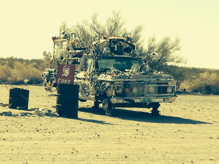 As we were exiting the mountain and looking around the painted cars, we were curious about the tents set up beyond. We ask a couple gentlemen, one of which was “Builder Bill” if that area was Slab City. Oh no they say, those were just a group of motorcycle club folks there for the holiday weekend. He said Slab City was further down the road, and that if we liked unusual housing developments, go take a look. We do, and we did.