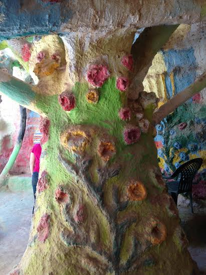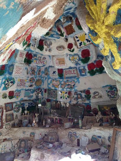Oh my Lord. Wow. These “rooms” were amazing. To your left, Leonard created this adobe domed room, a Hogan, which he originally had planned to house himself during the hot summer days. You see, Leonard had lived in his truck, parked in front of the mountain. Within the painted walls of the Hogan, visitors have left all sorts of mementos — dolls, pictures, bibles, flowers, notes. It felt very shrine-like to me, as if leaving a symbol to respect a patron saint. I just kept looking around, behind, above.