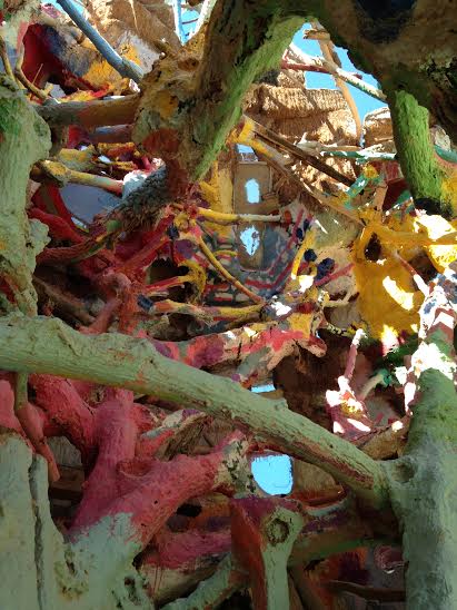 We walk out to the rooms with the tree branches, which Leonard had coined the Museum and is the area he was working on prior to his health problems. Simply amazing. Colors abound, branches here and there, windows looking in looking out, God is Love. I want to lay down on the dirt and look up at the blue skies trying to sneak through the greedy tree limbs. It would be eerie to stay there overnight while the stars sneak a peek to find you.