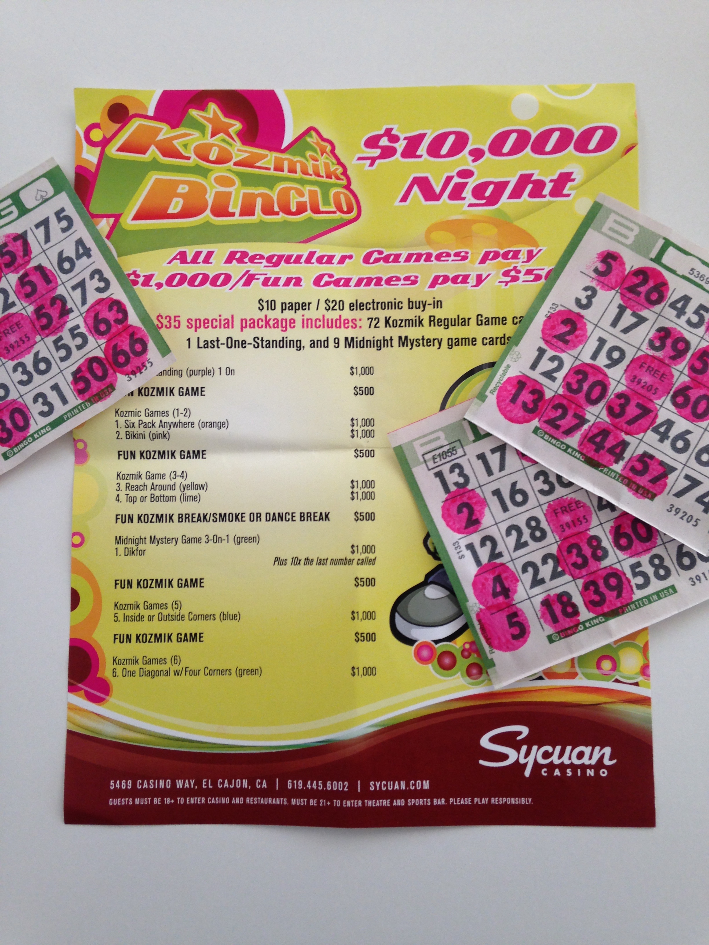 When we arrived at Sycuan at 10:30, and after comedic errors in trying to find a parking spot, I thought we had plenty of time. I was wrong. Little did I know that Kozmik BinGLO is very popular in the east county of San Diego, and this would end up being a sell out night. When we got there, lines to purchase your game cards were wrapped around the slots, and seats in the bingo hall were nowhere to be found. Luckily, my friend Rosey arrived earlier and found us four seats in the back row of the non-smoking section (one thing I hate about casinos is walking through cigarette smoke).