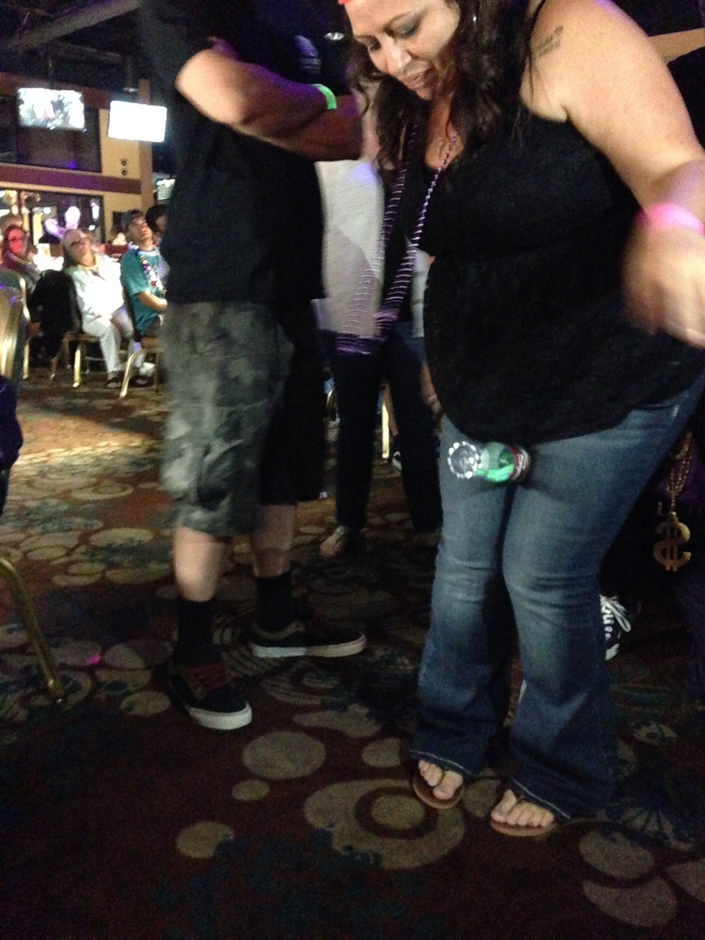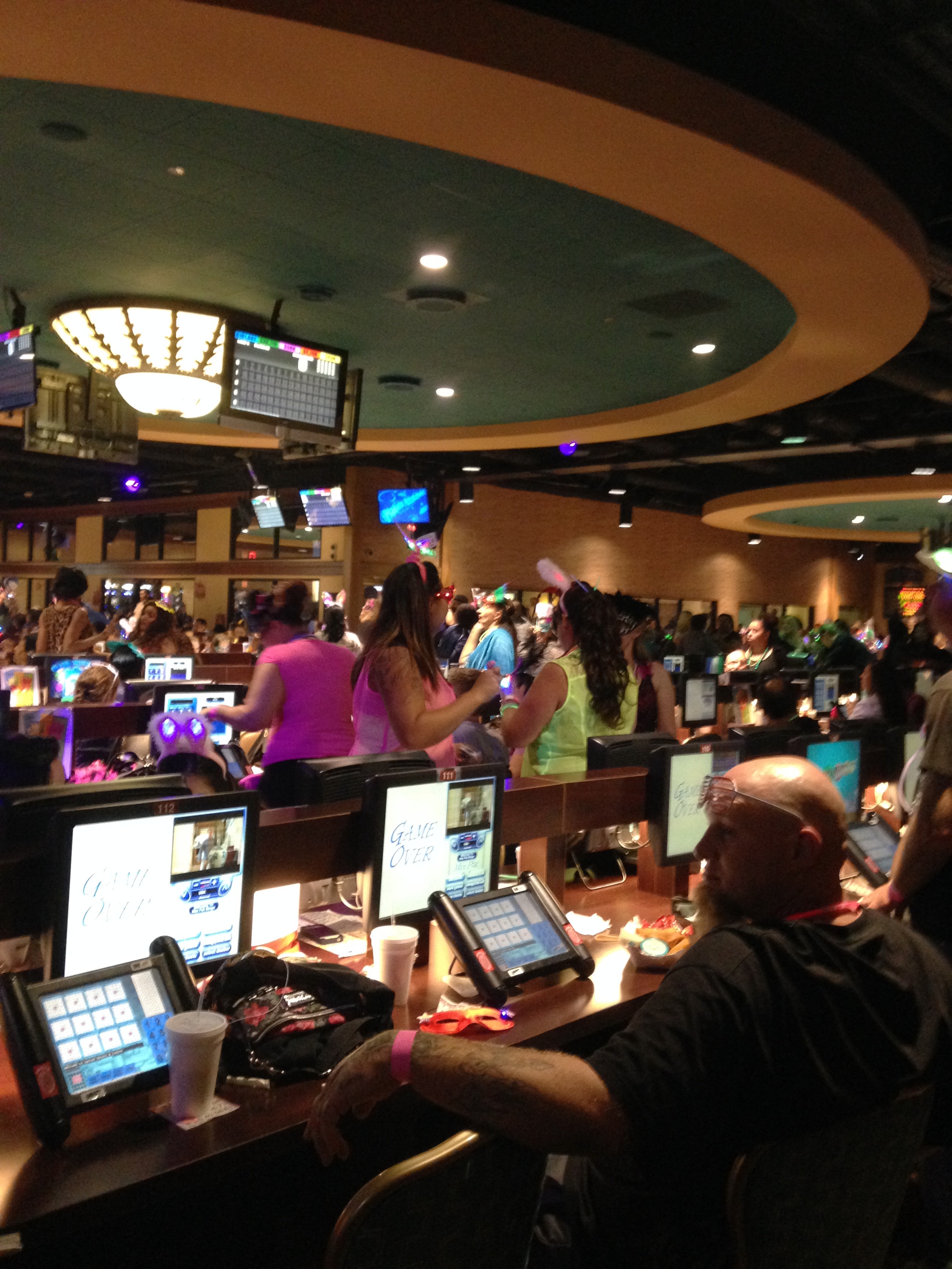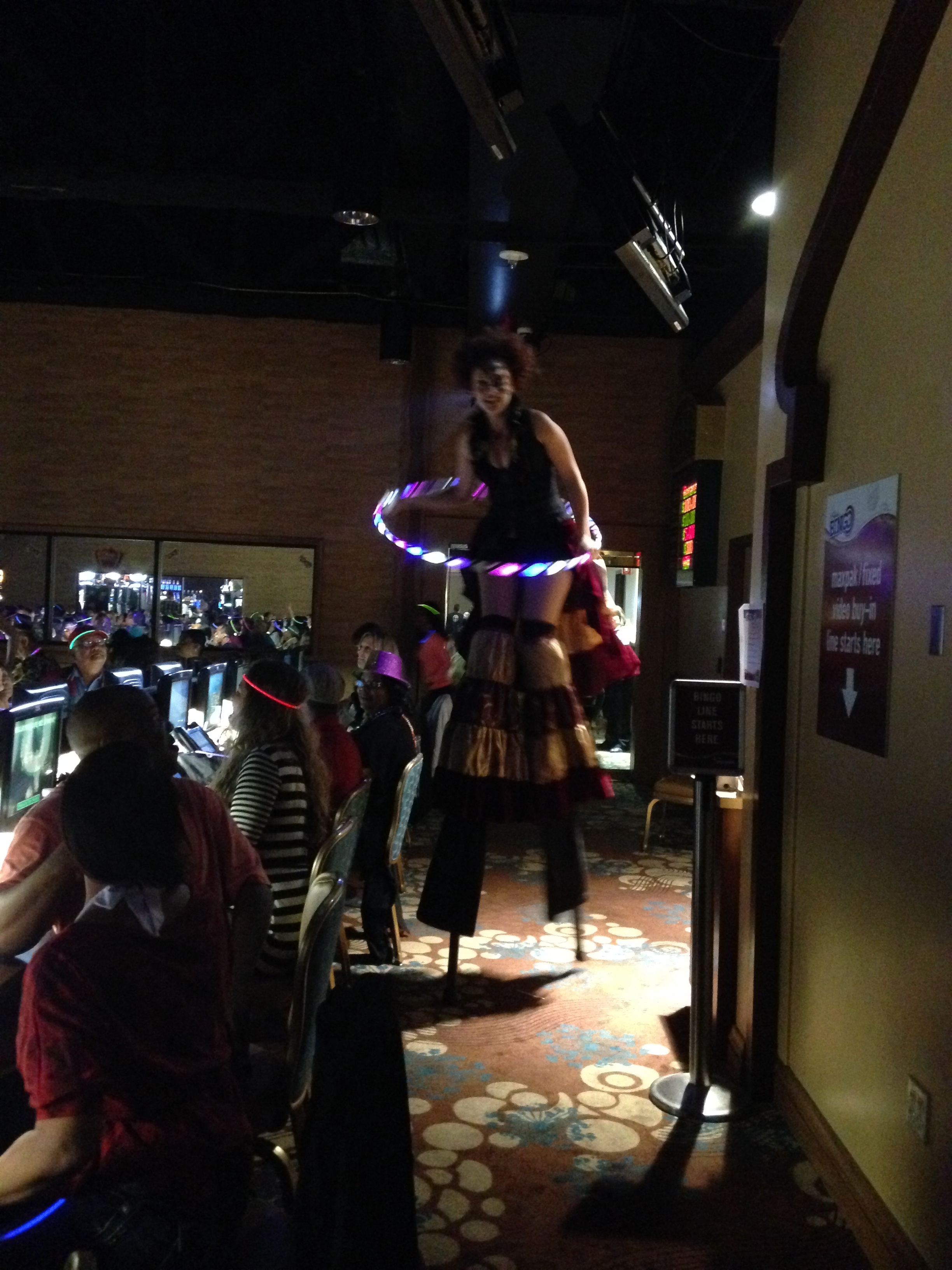 Oh, did I mention this was a special themed BinGLO night? Yup, it was a Mardi Gras celebration. Not only do people dress up with glow in the dark necklaces, clothing, and bunny ears, but add your Mardi Gras beads, hats and masks, and it’s the making of one heck of a party! They have a DJ playing club music, people walking around on stilts, ladies lifting their shirts (not me…you need to throw beads my way for that). And let’s call us the Back Row Divas, because soon enough we’re all getting up in the space behind our seats and start moving to line dance sequences, making sure we’re in sync and wearing that we’re too cool straight face. There’s plenty of dudes around too, but as usual, the ladies start the fun.