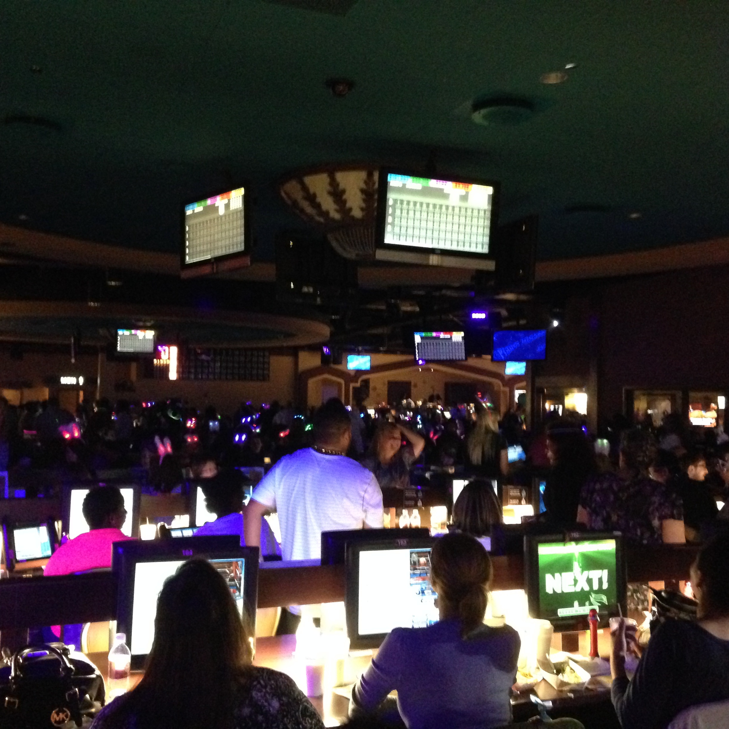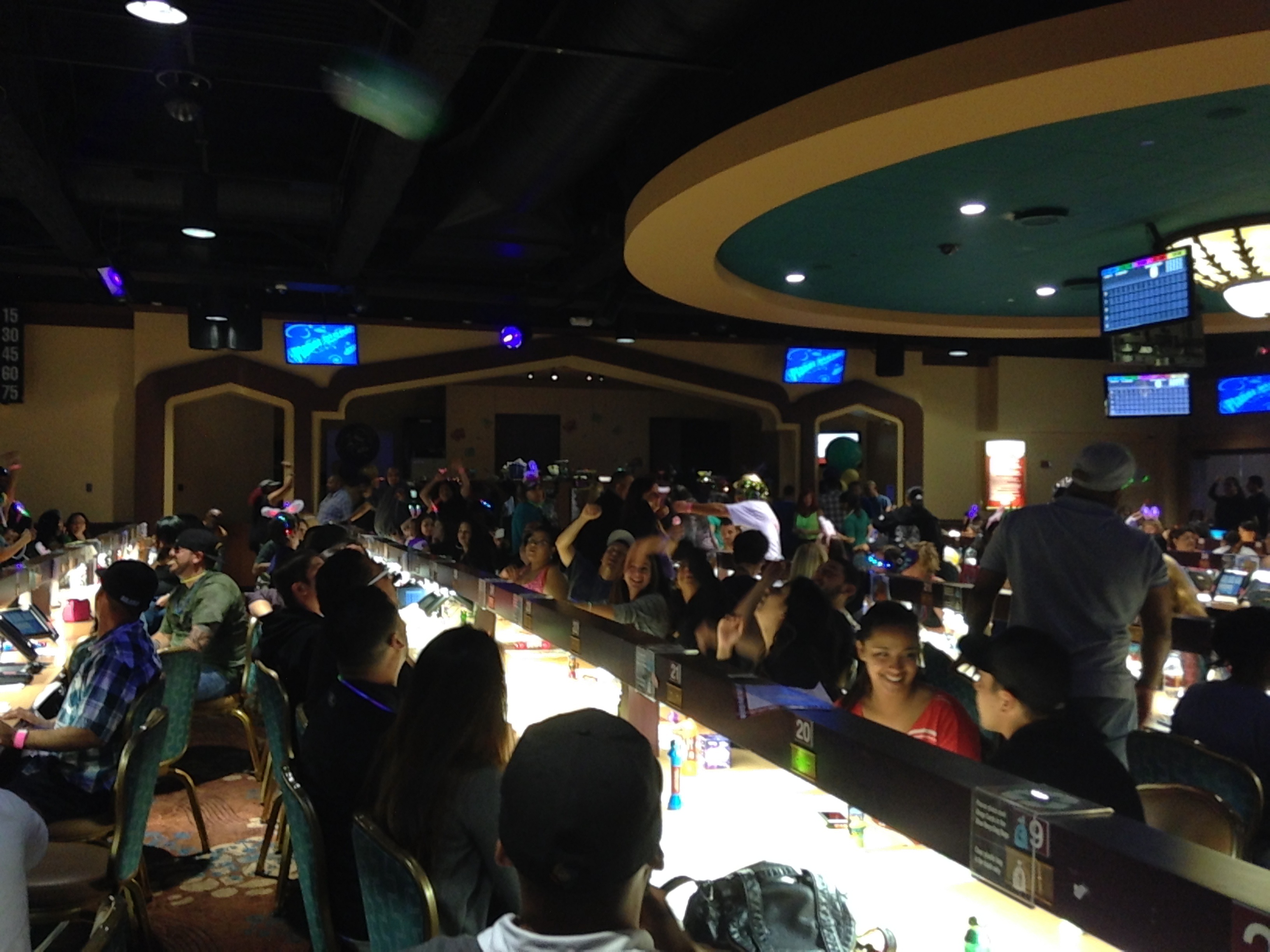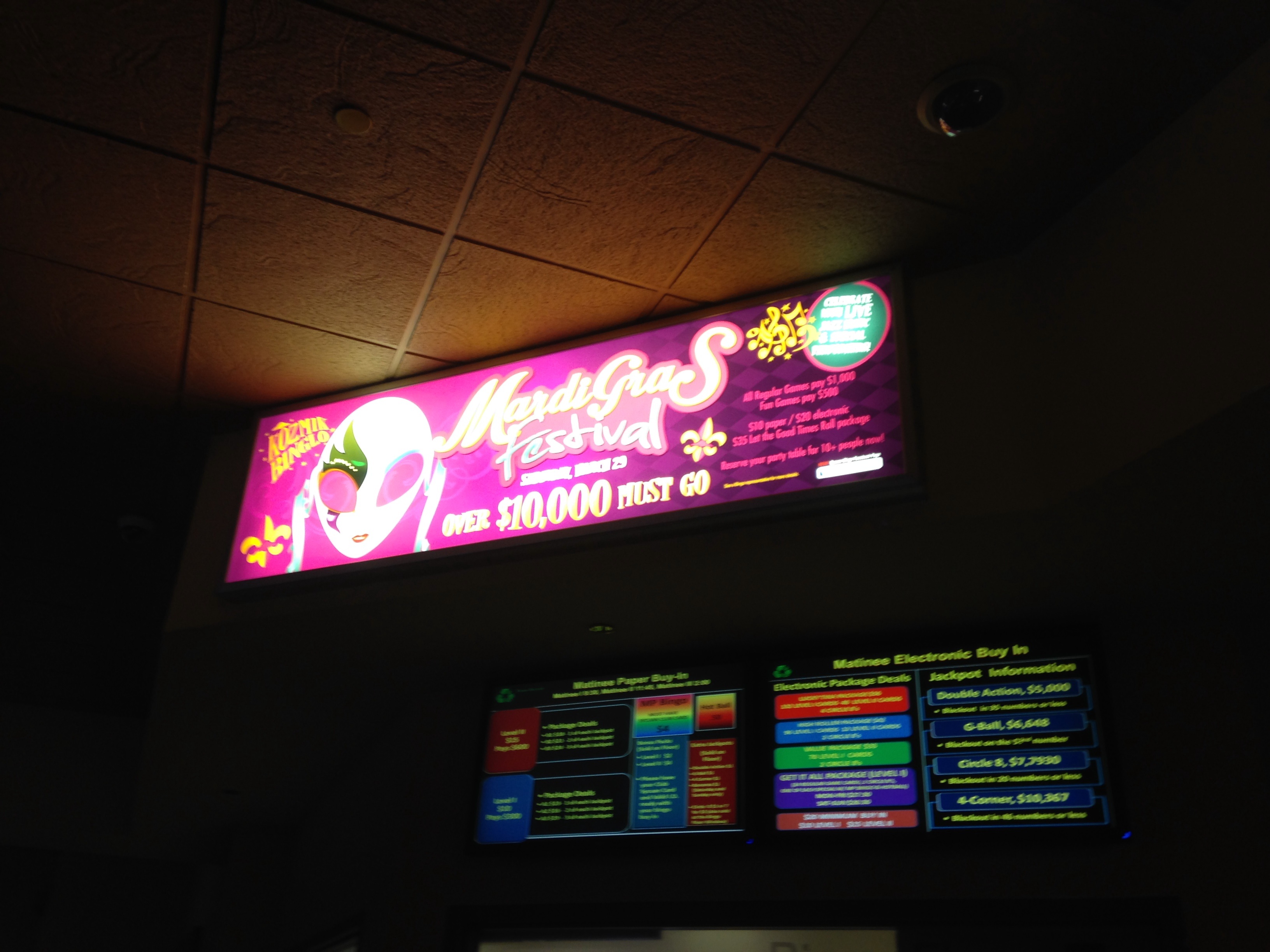 Oh, did I mention this was a special themed BinGLO night? Yup, it was a Mardi Gras celebration. Not only do people dress up with glow in the dark necklaces, clothing, and bunny ears, but add your Mardi Gras beads, hats and masks, and it’s the making of one heck of a party! They have a DJ playing club music, people walking around on stilts, ladies lifting their shirts (not me…you need to throw beads my way for that). And let’s call us the Back Row Divas, because soon enough we’re all getting up in the space behind our seats and start moving to line dance sequences, making sure we’re in sync and wearing that we’re too cool straight face. There’s plenty of dudes around too, but as usual, the ladies start the fun.