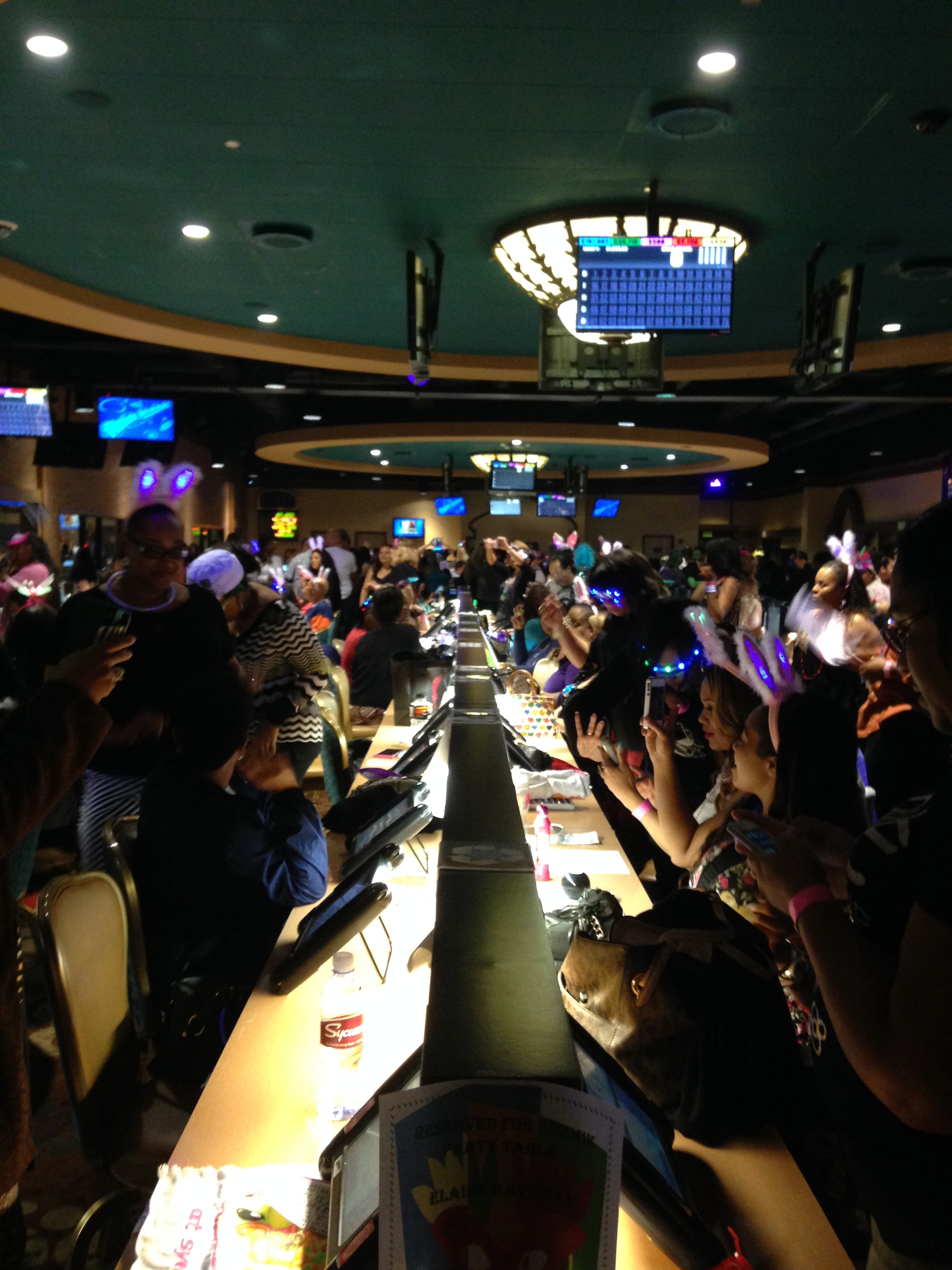 Next time. It’s like when you go on vacation to someplace new, you always think about what you will do next time. So, next time I come to BinGLO, and there will be a next time, I plan to arrive much earlier and get seats located closer to all the action. Although us Back Row Divas created our own fun, it’d be nice to see what the DJ was actually referring to. And more the merrier for this activity, so guys and gals, you’re all invited. It would be a great place for birthdays and pre-wedding celebrations. Baby showers, no. And even though I’m not a big buffet person, I would get there even earlier to indulge; then play some of the other casino games. It is a lot closer than Vegas…I wonder what other local casinos may offer a Saturday club-like bingo parlor…hmm, more onsite research is needed.