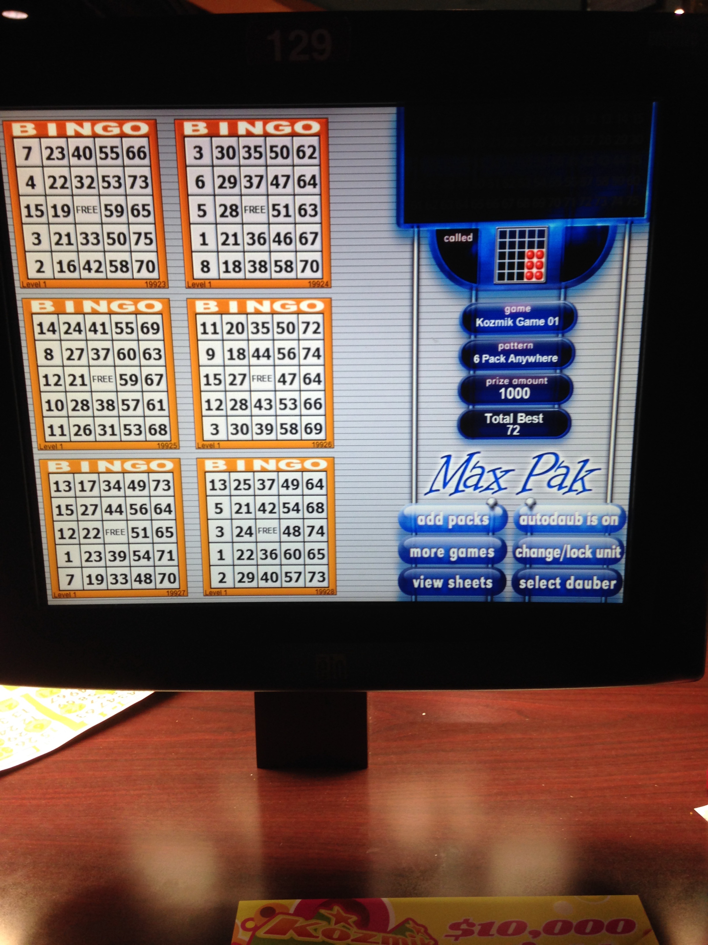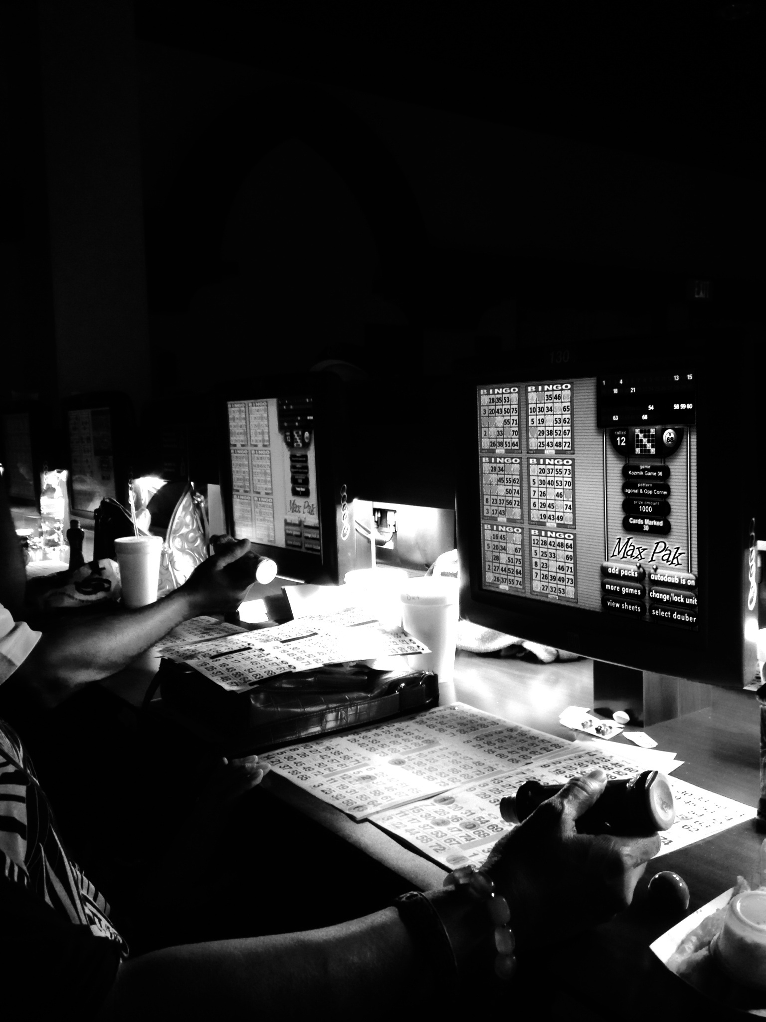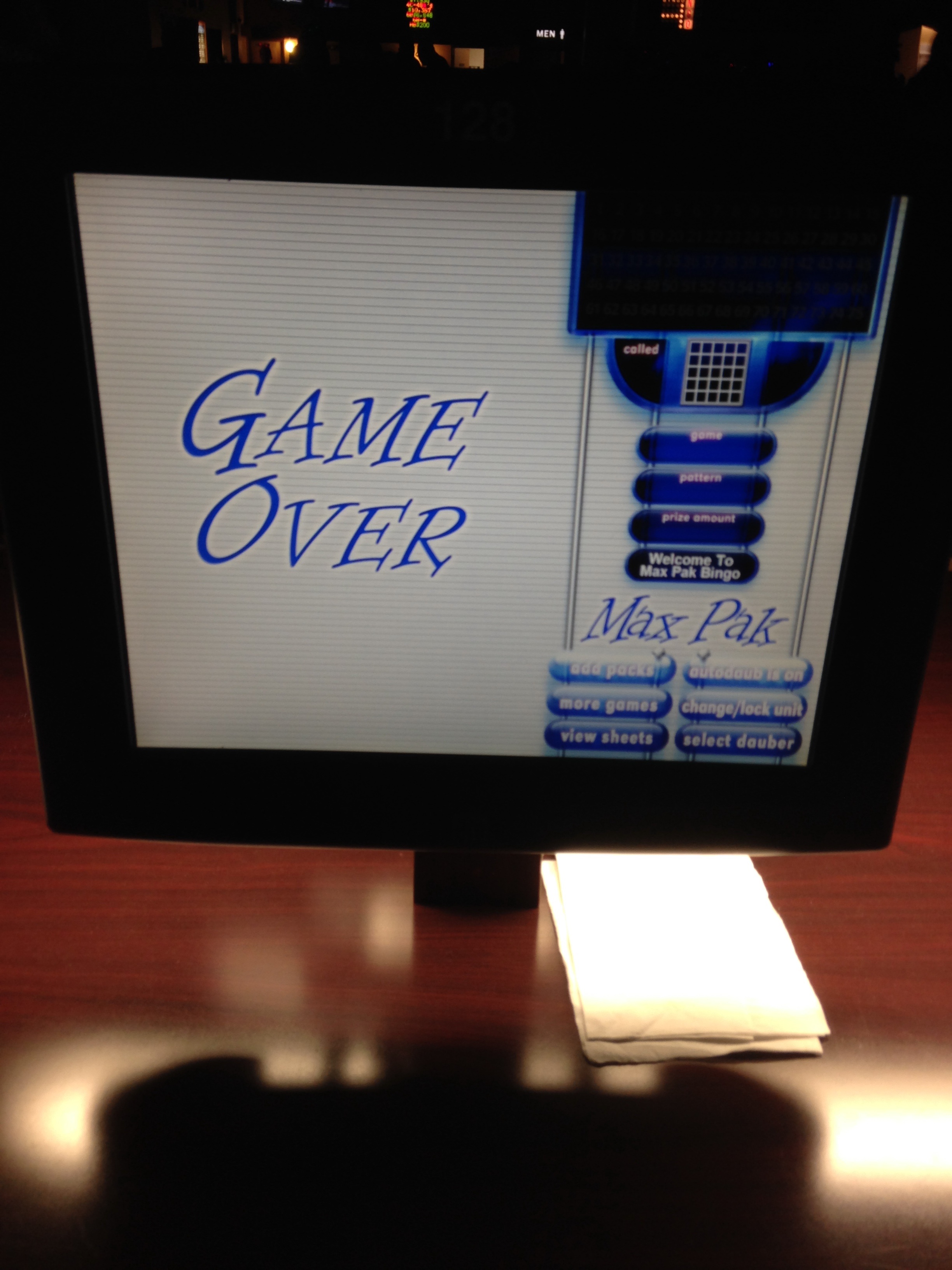 Oh, and also next time — I’m going to get some of the paper games too. There’s a reason why those ladies double fist their daubers, it’s kinda boring just watching the computer screen tell you how many more numbers you need. I didn’t even realize I had 72 game cards going on, because silly me didn’t click around the screen to see that there were pages of game card screens to view. There’s a little bit of little old lady in me already. Hey, I can double fist with the best of them.