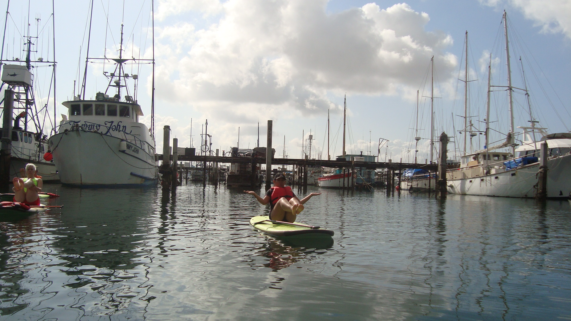 Then I get to the water’s edge. Again, what I imagined it to be was not. At this particular location in Point Loma by Shelter Island, they don’t wade out from beachside in shallow water, but rather paddle out dockside amongst the boats. Other locations do start beachside, but the location that Lacy gathered a bunch of friends for this morning excursion does not — Lacy you are going to kill me girlfriend! Well, they reassured me it wasn’t that deep, and that they would all be closeby to save me if I fall into the water. But when I’m still recovering from thoughts of thinking I was going to drown from my Week 17 Jetpack experience, and I can’t see the bottom, I’m a little apprehensive. Why can’t San Diego have clearer waters?