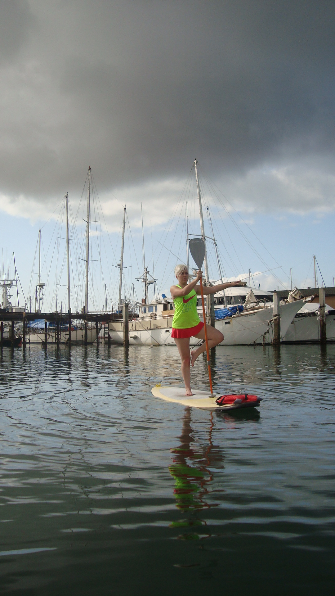 I stay in a position sitting back on my legs and slowly start paddling off with Lacy close at my side. I don’t dare try to stand up. I am well-balanced, right in the middle of the board, over the designated “keyhole” which acts as your location guide on the board. I am like a mannequin, not moving one bit — well except to paddle. I set a stroking pattern. Three strokes on the right, three strokes on the left, repeat.