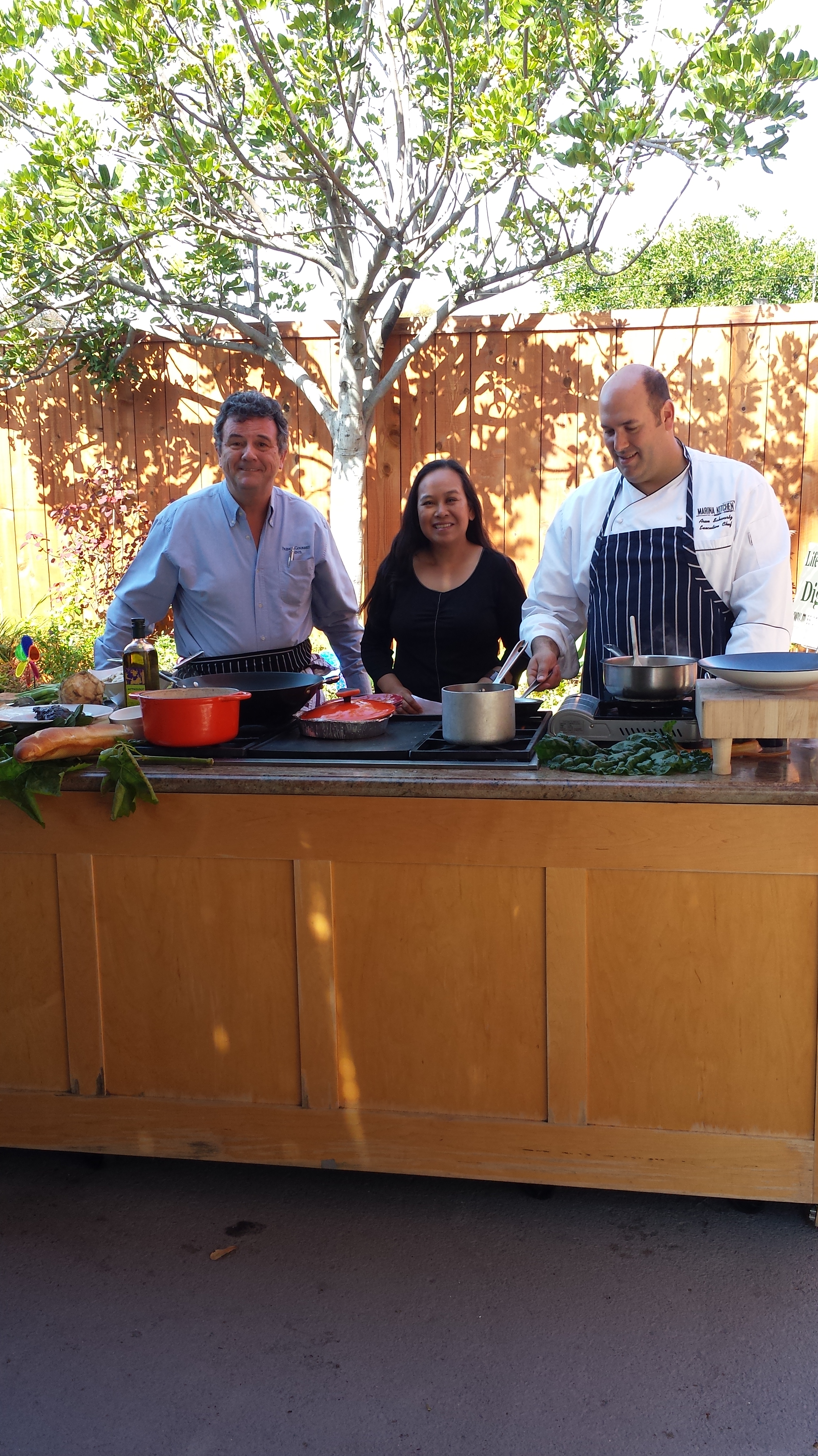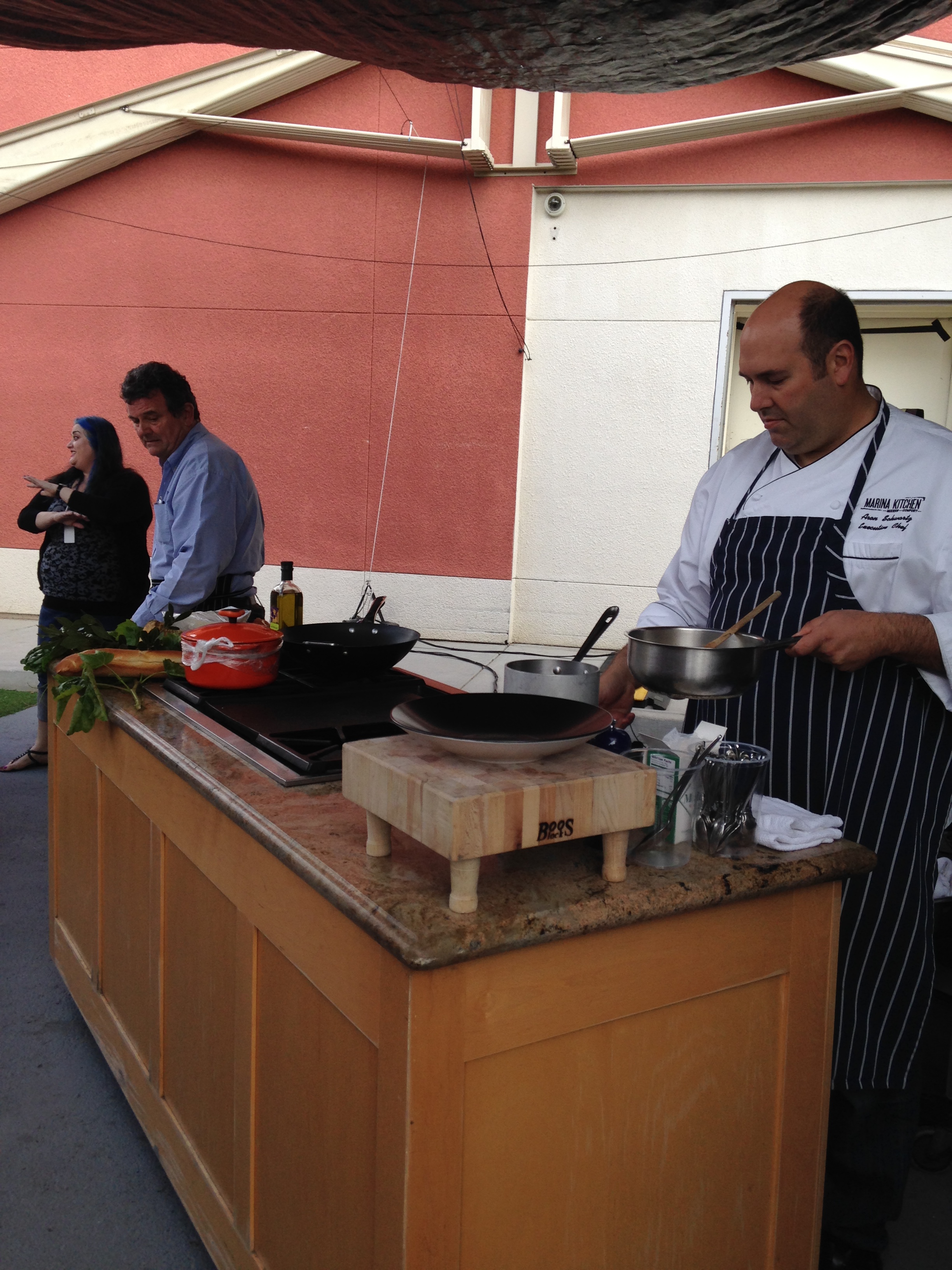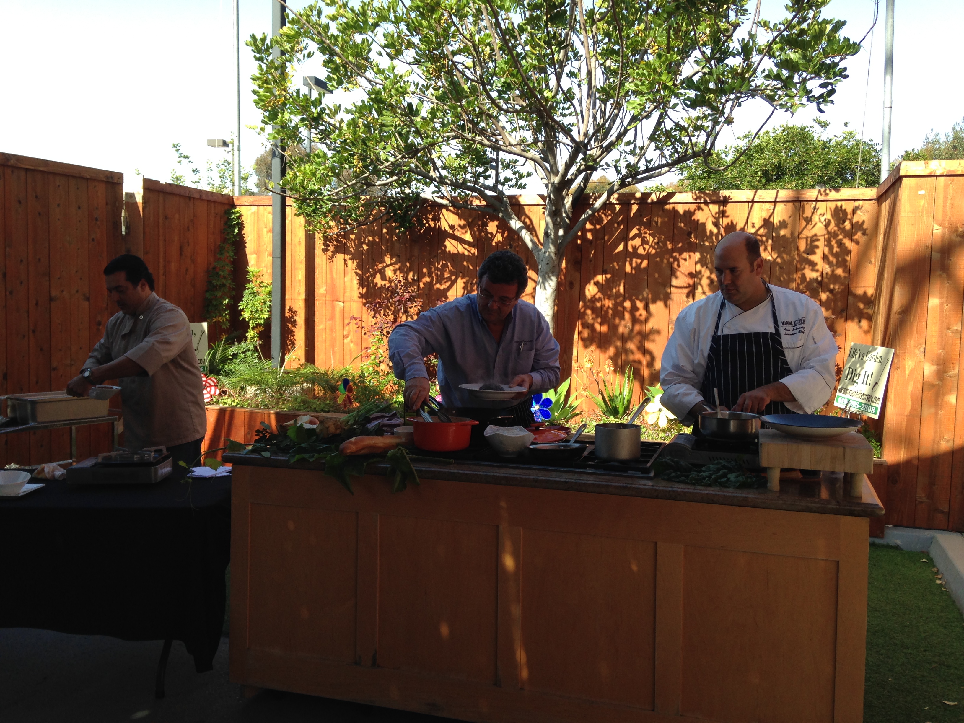The chefs have all arrived and are figuring out where to stake their territory. Now, we have four chefs here, and when I had told a friend of mine, who’s also a chef, about the TV segment, his comment was “egos will fly.” Well, of course, they all happen to be men. But, actually they were all very nice and cooperative, exchanging business cards. Chef Michel Malecot from The French Gourmet, I will say is quite comfortable in these settings and is a real pro — he has been supporting TOT since the beginning!