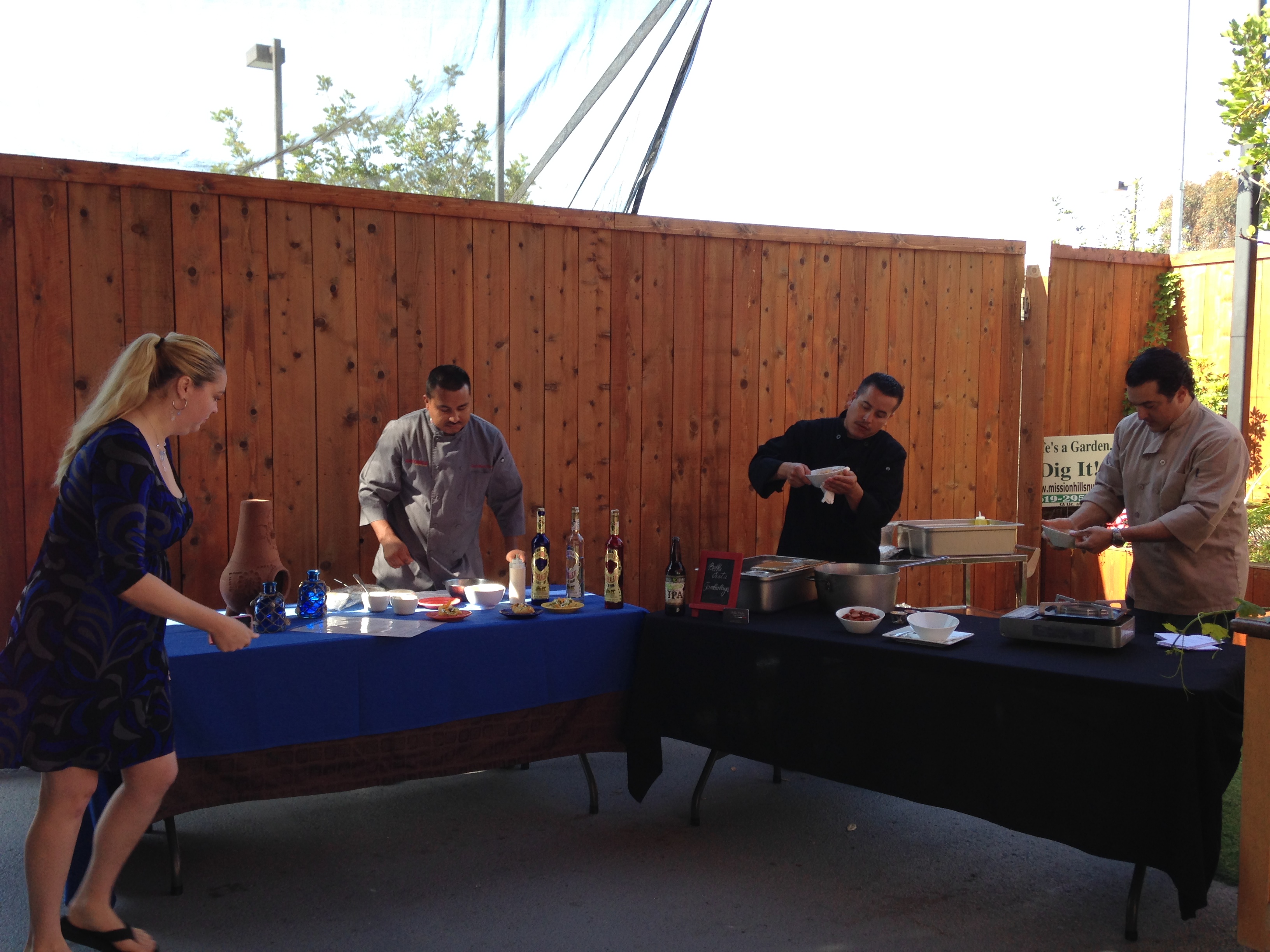 The fire/flood guys are ahead of us, so they take up the outdoor grass area first, and when they are done, then Chefs Michel and Aron Schwartz, from the Marine Kitchen, have to roll their set up over, then the Bella Vista Social CLub and Caffe guys, Chefs Jose Ledesma and Michael Garner have to take the other table, clear it off and put together their set up. Meanwhile, Cozymel’s Chef Miguel Flores and General Manager Amber Johnson have already set up their table, with a few bottles of tequila — is that just for decor? I guess it’s unusual to have so many chefs together for this type of segment.
