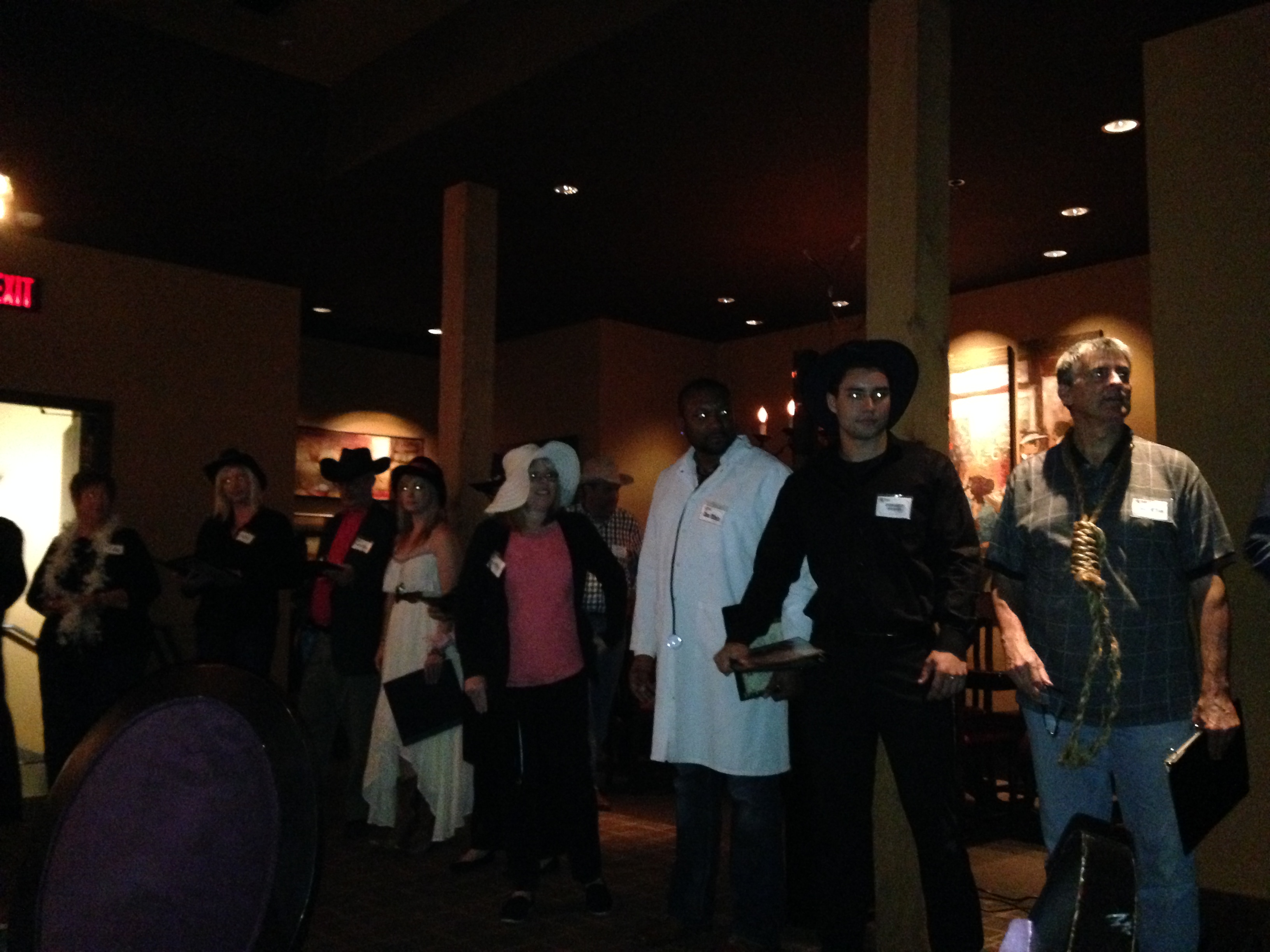 And wouldn’t you know it, Marie had to work at the show — she was tapped to play the role as Pearl de Vere, the fashion shop owner, aka the Madame. That’s what happens when you sit at the end of the booth. Yes, Marie the Madame was the local brothel owner, and had a bevy of women at another table who all worked for her. And what a lively group of broads they were, not sure how many tequila shots they had throughout the night, but they were having a grand ole time.