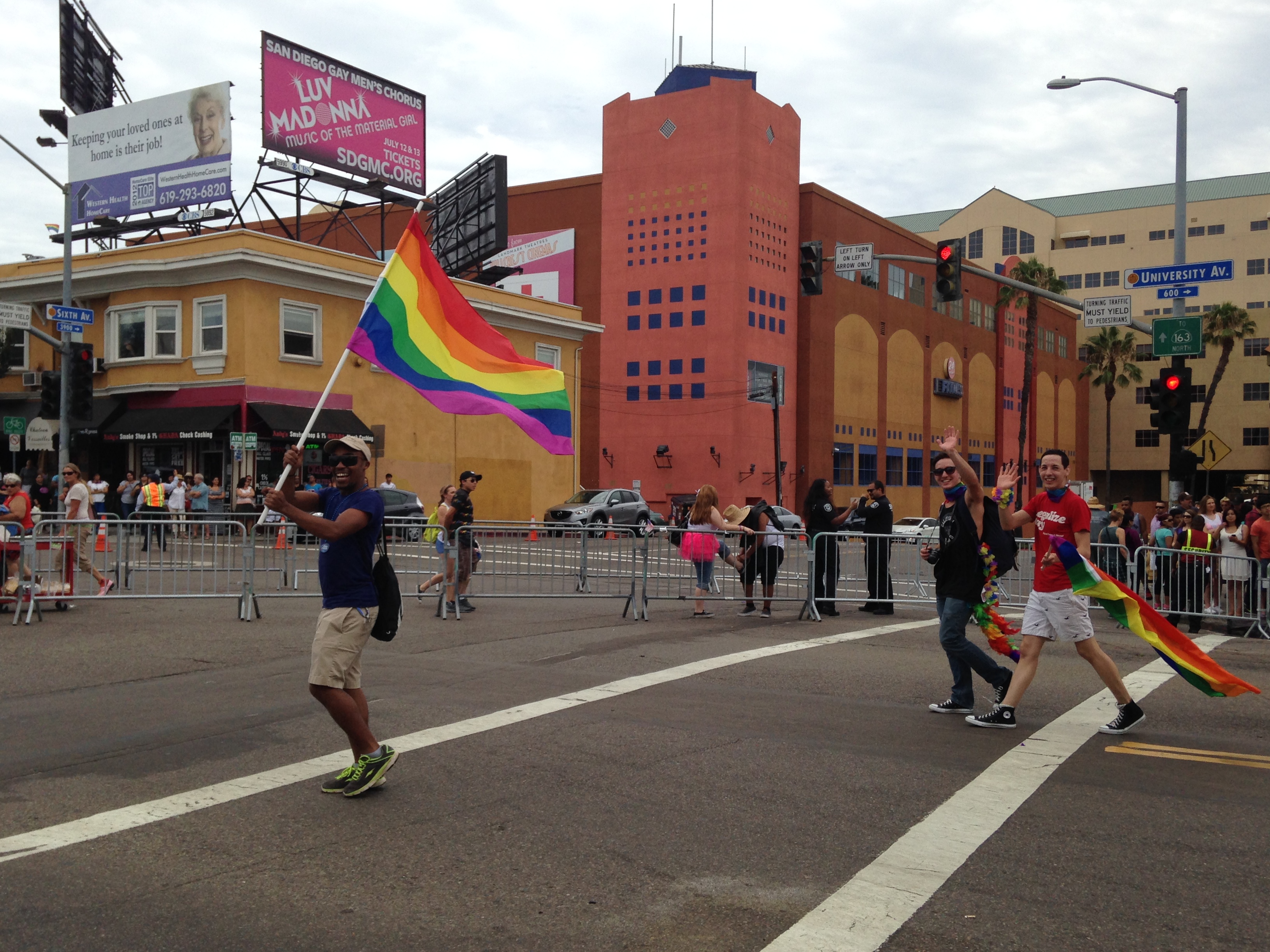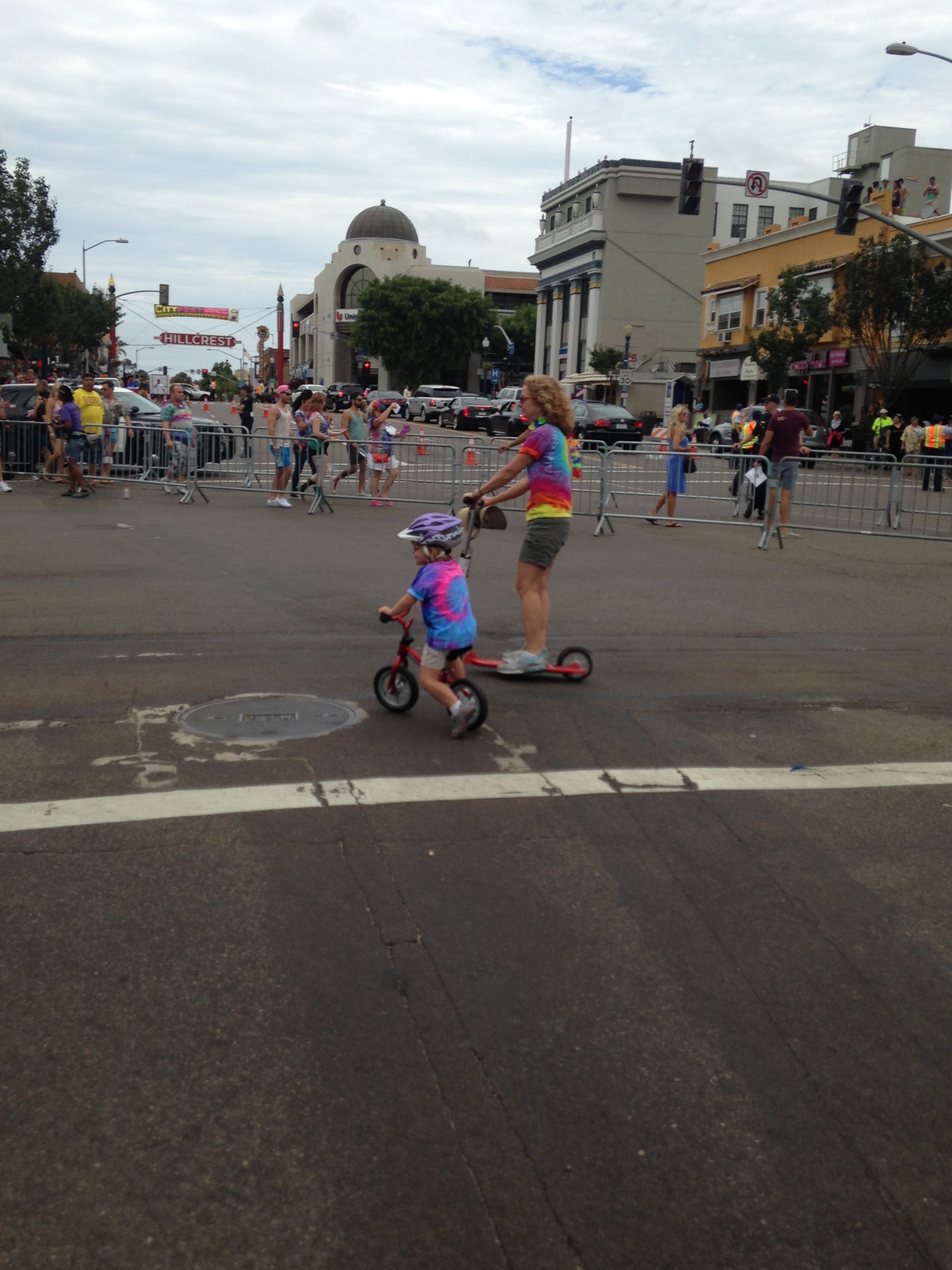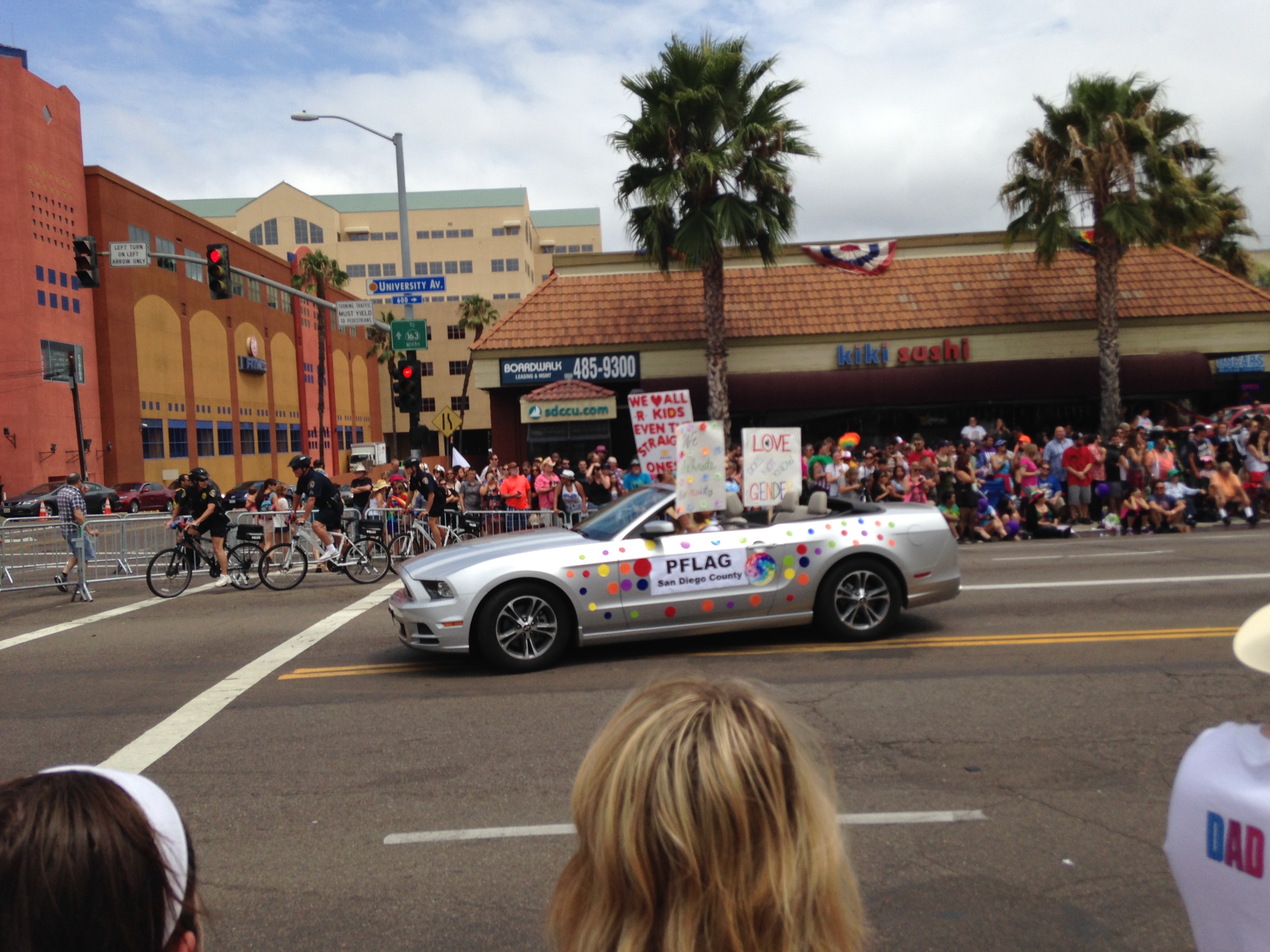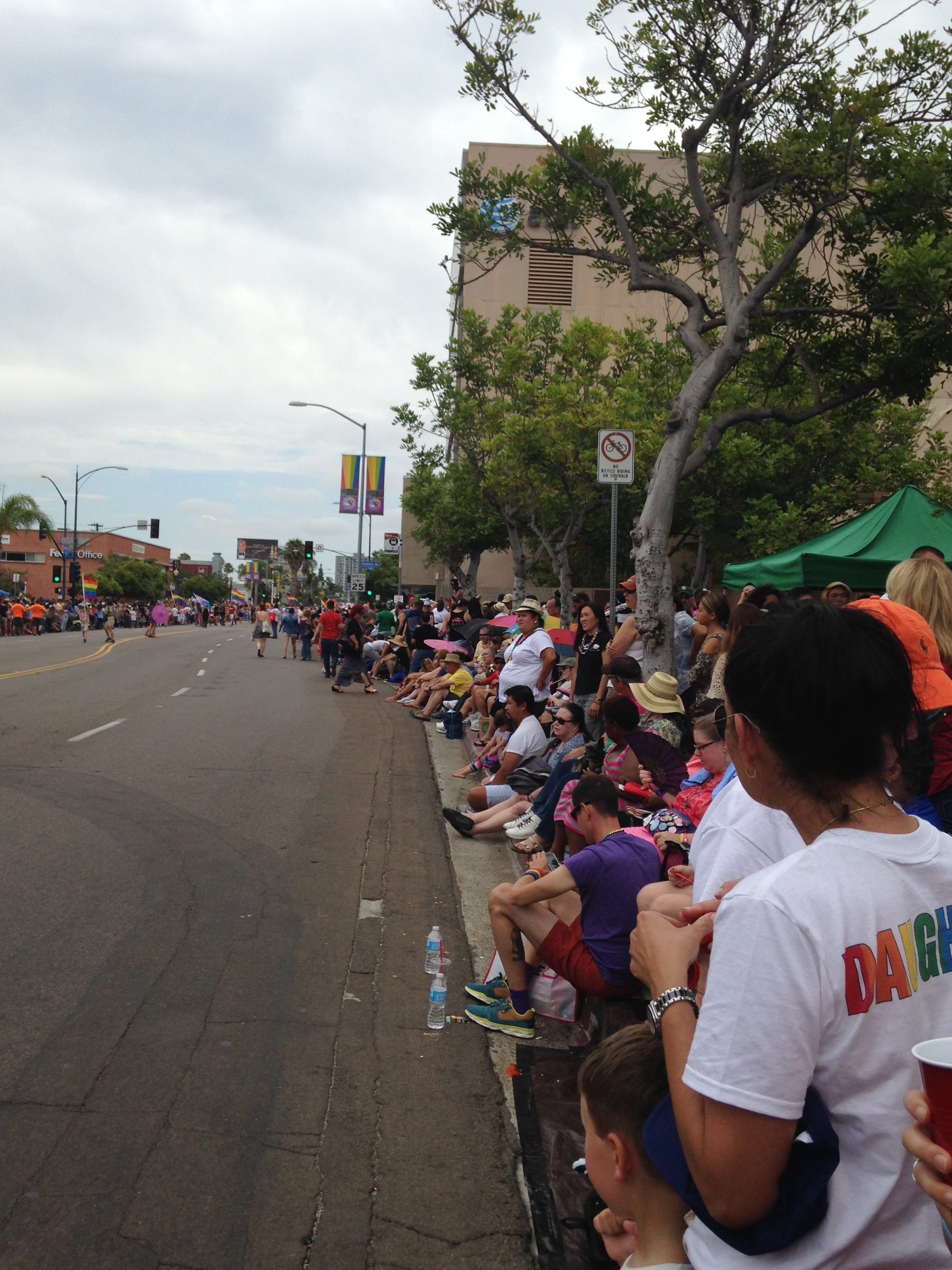 We claim a great location at the corner of University and Sixth, where we figured was a spot that Parade participants needed to stop and turn the corner. Already I can tell this is going to be one fun parade. Many spectators themselves were dressed for the occasion, Kelly had on a cute rainbow tutu. Lacy was wearing a colorful blocked dress (later a drag queen commented how she loved Lacy’s dress, and a gay guy said to his boyfriend to look at her great tits).There was a lovely family next to us whose young boy designed a rainbow t-shirt for them to wear, with labels of Dad, Dad, Daughter and Son on the backs. Lots of skimpy clothing too — both men and women. I just had to look at a woman’s ass that was half exposed, you couldn’t miss it.