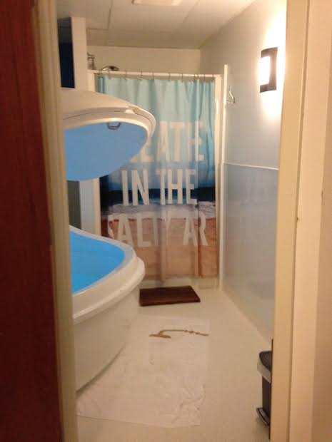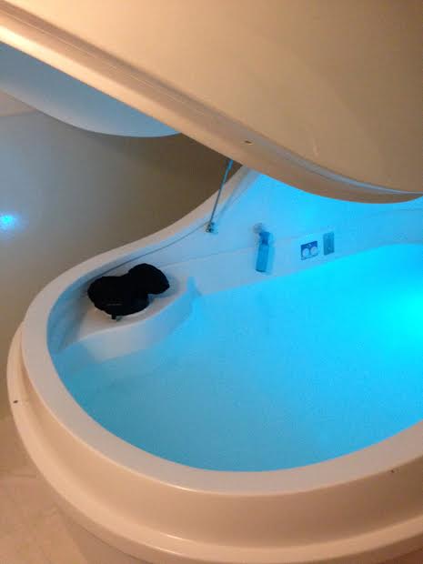 The very nice male attendant (I forgot to ask his name), showed me to my chamber which includes a private shower. You go in the float tank butt naked, and need to shower immediately before and immediately after your session. A ton of Epsom salt is in the water, which is what helps you float. He showed me how to close and open the cocoon; there is no lock and it uses hydraulic bars, so it opens easily. I wouldn’t want to get trapped in there. He also showed me how to turn on and off the lights and Muzak, and he told me that most people turn them off about five minutes into the session. Part of the float therapy is in experiencing sensory deprivation, which is why it’s dark and quiet. I’m also given ear plugs to help deafen any noise. He also lets me know that the music and lights will automatically turn on when I have five minutes left of my session.