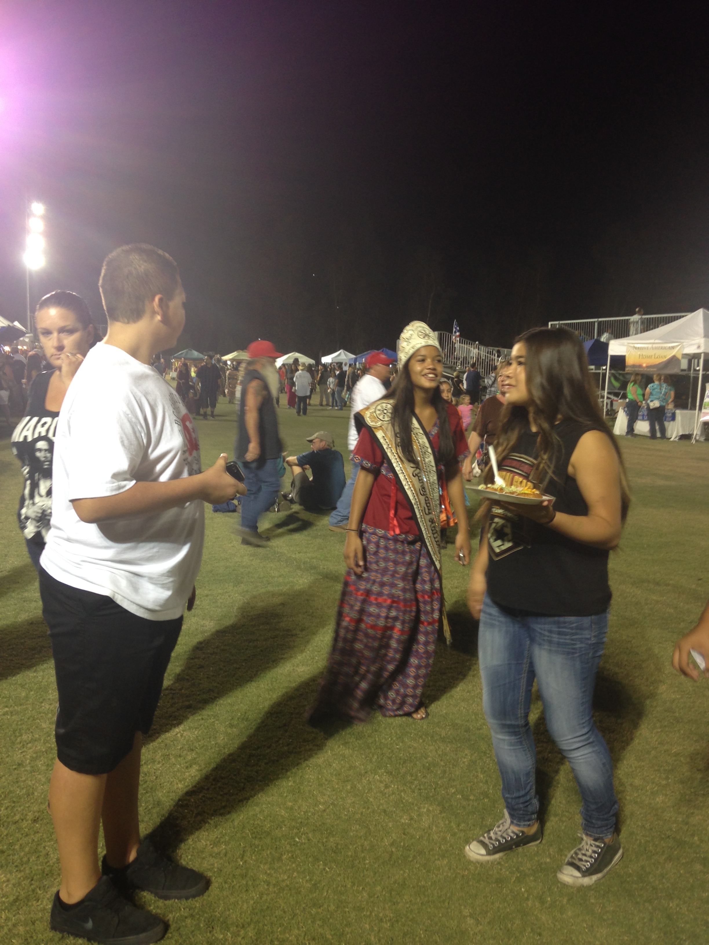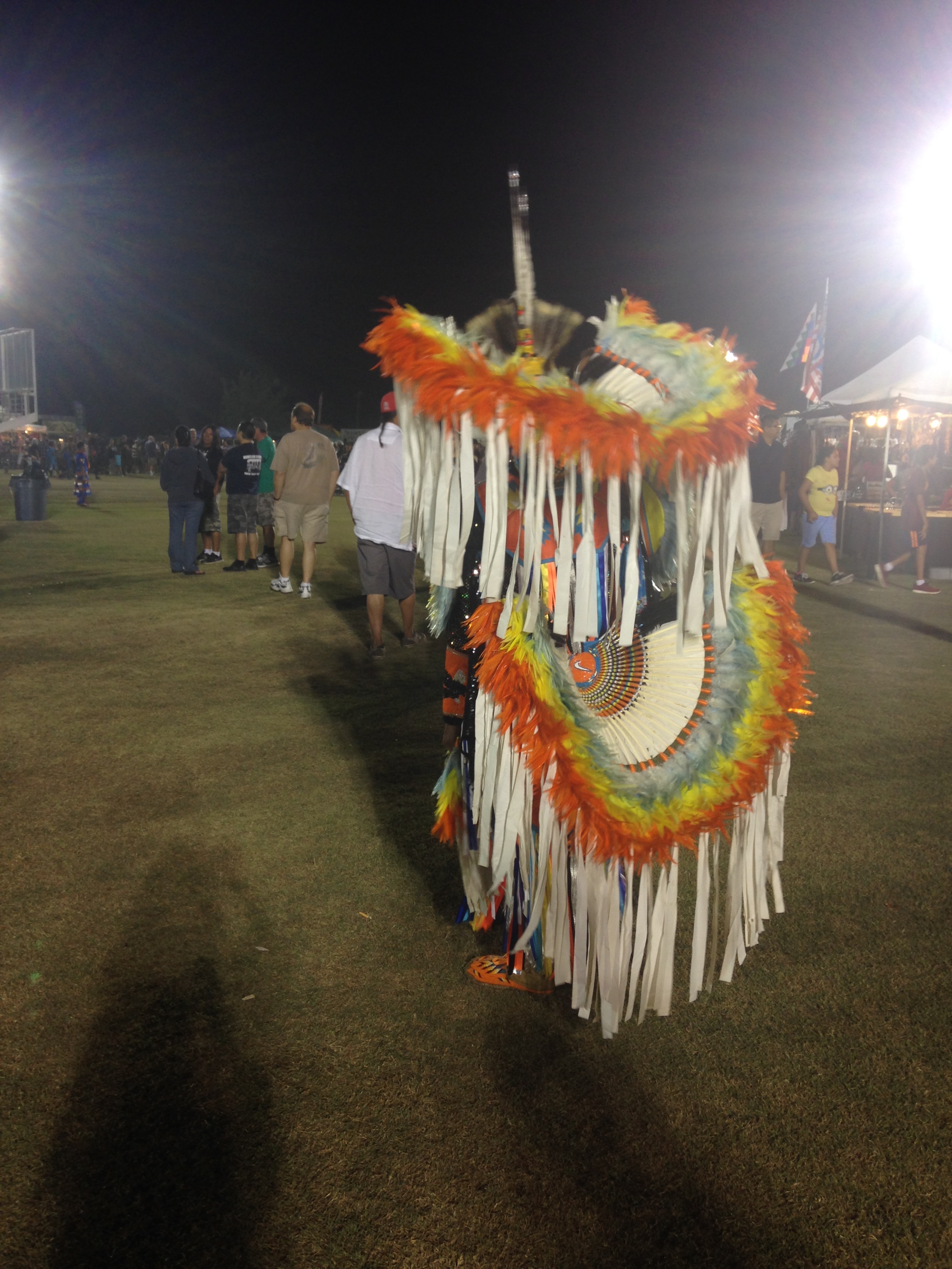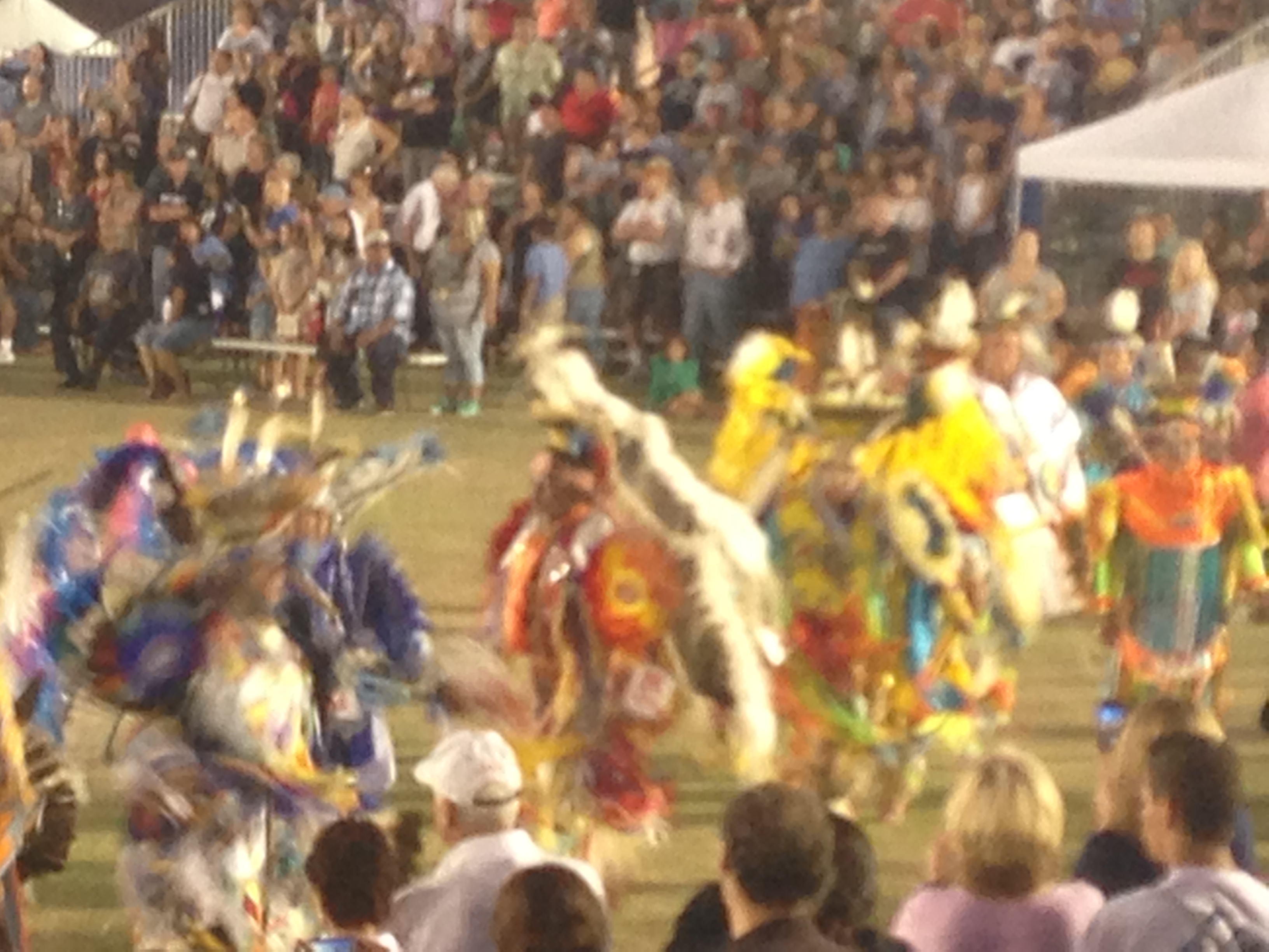 We sit under one of the humongous white tents, plopping down in the middle of all the other saved chairs. We can’t tell if the areas are reserved for certain groups, but oh well, I guess we will sit until someone tells us to leave. There is some Gourd Dancing contests going on, primarily with the younger age groups. We notice there are two groups of drummers, the center drum circle which look to be elder types and experienced, and the outer drum circle, which seemed younger and more energetic.