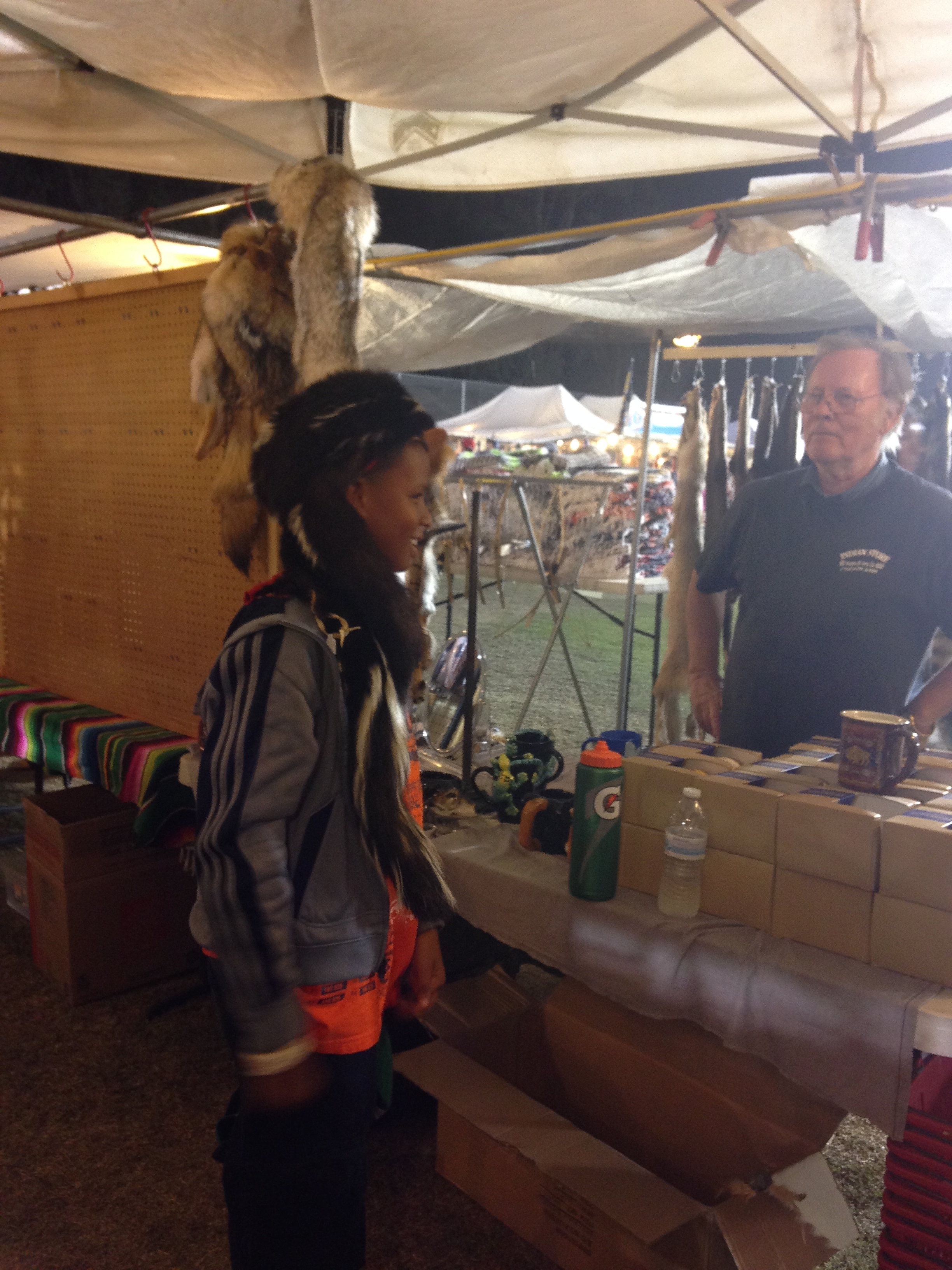 These things happen in threes right, so hopefully that is it. We quickly regain our campsite, and put up the tent. In hindsight, buying a new tent was a better choice, as the borrowed one looked very complicated. Tent in place, we then decide to head on over to the Pow Wow and see what’s going on. First thing we see are all the merchandise vendors; later. We head on over to the food vendors and I get a much needed ice cold lemonade, and Richard inhales an overloaded chili cheese dog. (I’m going to start calling him Hoover.)