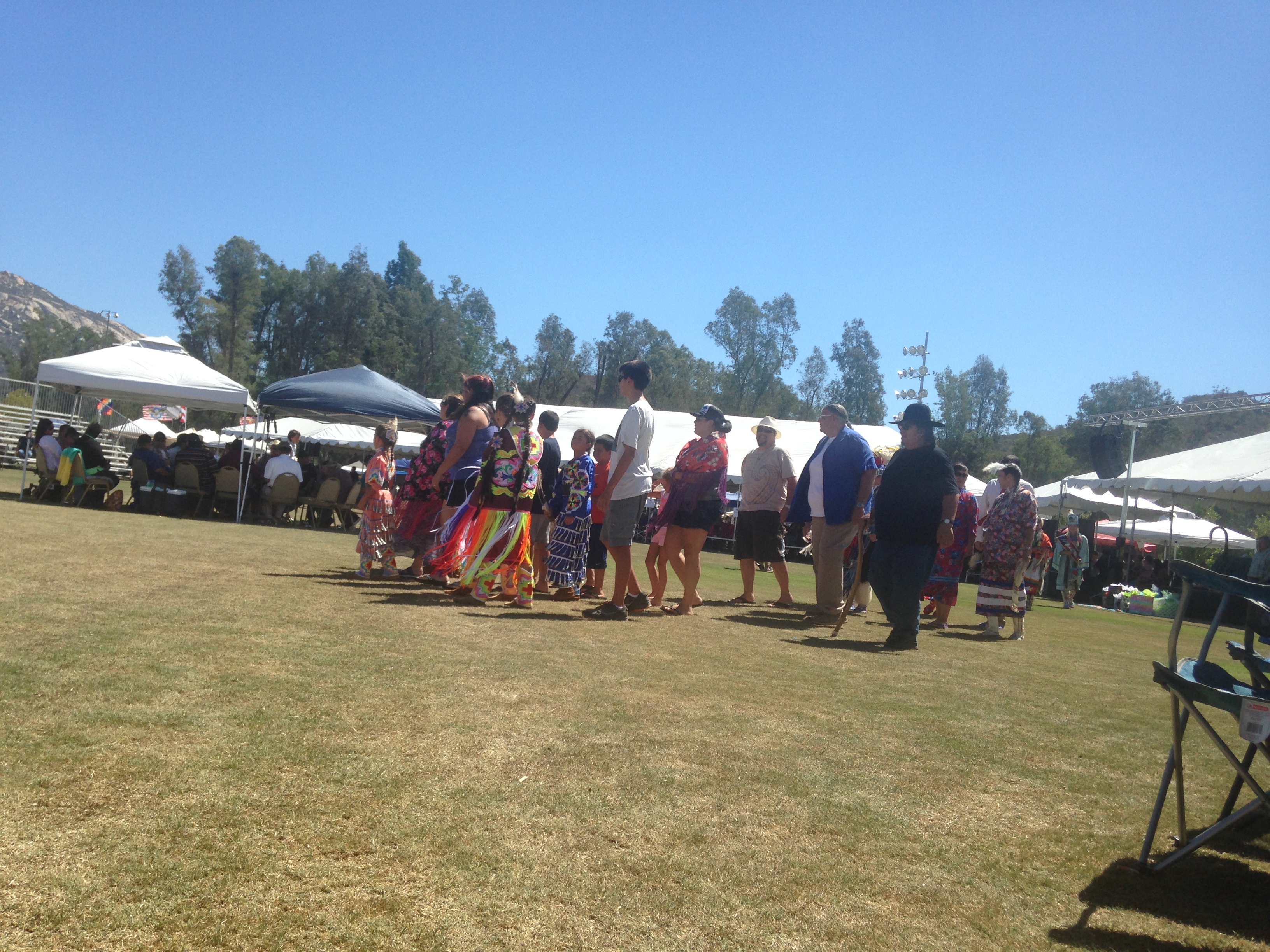 The day didn’t start off so great…it was actually horrible. As Richard and I begin the trek to the Barona Reservation for the Pow Wow, we first hit construction traffic near my house, which was a big pain in the you know where. Really, construction on a holiday weekend, really? Then as we leave the bank ATM, our exit was blocked by a delivery truck, and no driver seemed to be around. Finally, the truck was moved. Thankfully we are on the freeway headed east. Besides the escalating heat, everything seemed fine now. We get to the pow wow (the baseball fields) and the locate the campsites — basically any spot amongst the eucalyptus trees. We find a nice cozy area with shade and start to unpack and put the tent together. The tent was borrowed from a friend, and as we try to sort out the pieces, we realize the main tent itself was missing. Are you kidding? Now what? Richard decides that we will go north to Ramona, buy a tent and return. Okay. So we head on to Ramona, on some scenic roads that I had never driven on, find a Kmart and buy a tent for $25.