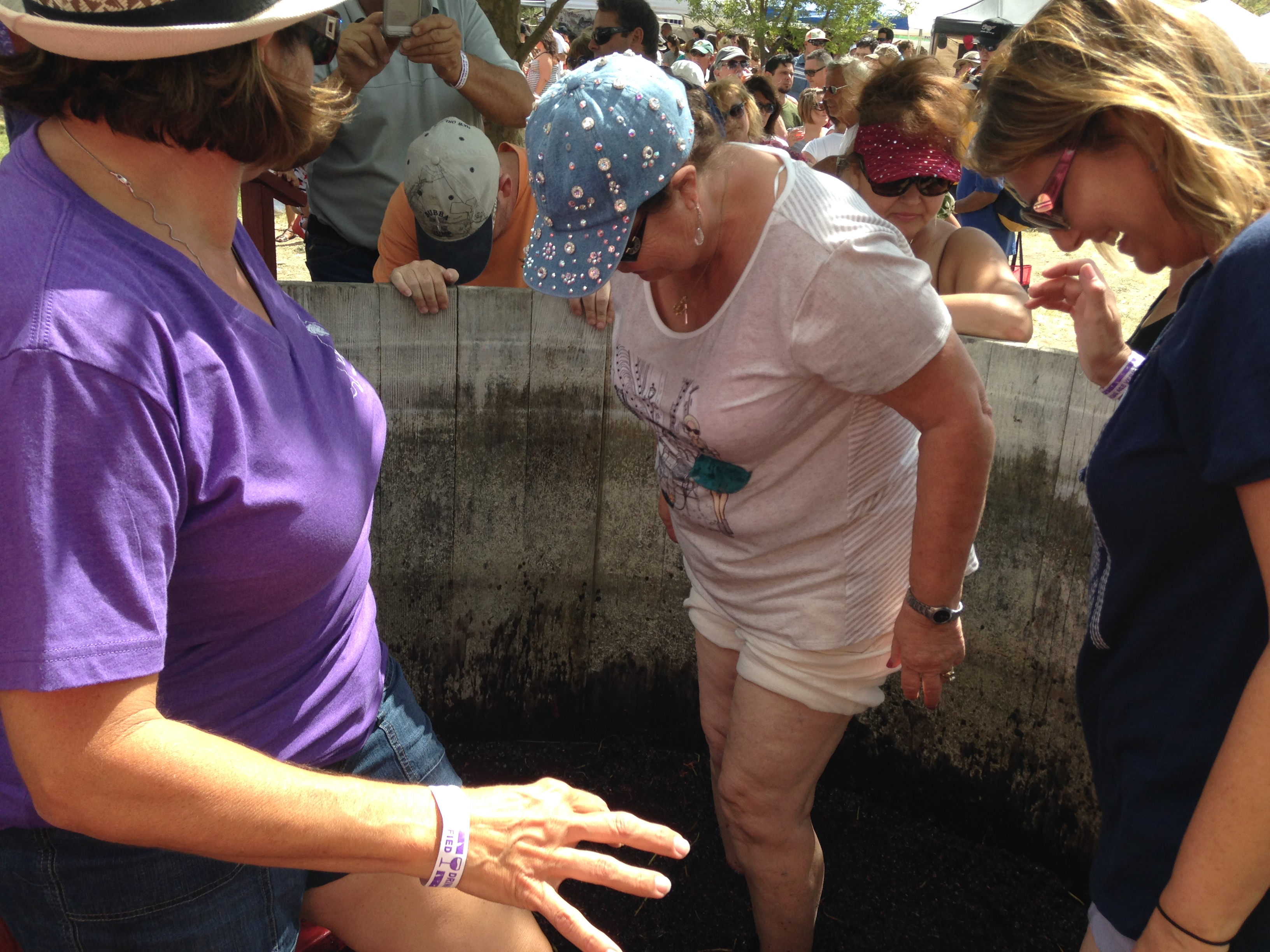 Even though it was miserably hot, we did have a great time waiting under the hot sun for almost two hours. Primarily due to, as Lynn said, a “wildly entertaining group of three women.” These women, with Italian heritages, had driven to Julian with their husbands from San Gabriel, a Los Angeles valley suburb. We got to talking with them (what else are you going to do but make new friends) and shared funny and true stories about life, marriage, family, kids, sex, and aging. They talked about their lives, we talked about ours, and we commiserated together — about the weather, what people were taking way too much time stomping in the barrel (that chick in the white tee – you know who you are), and is this stomping thing sanitary?