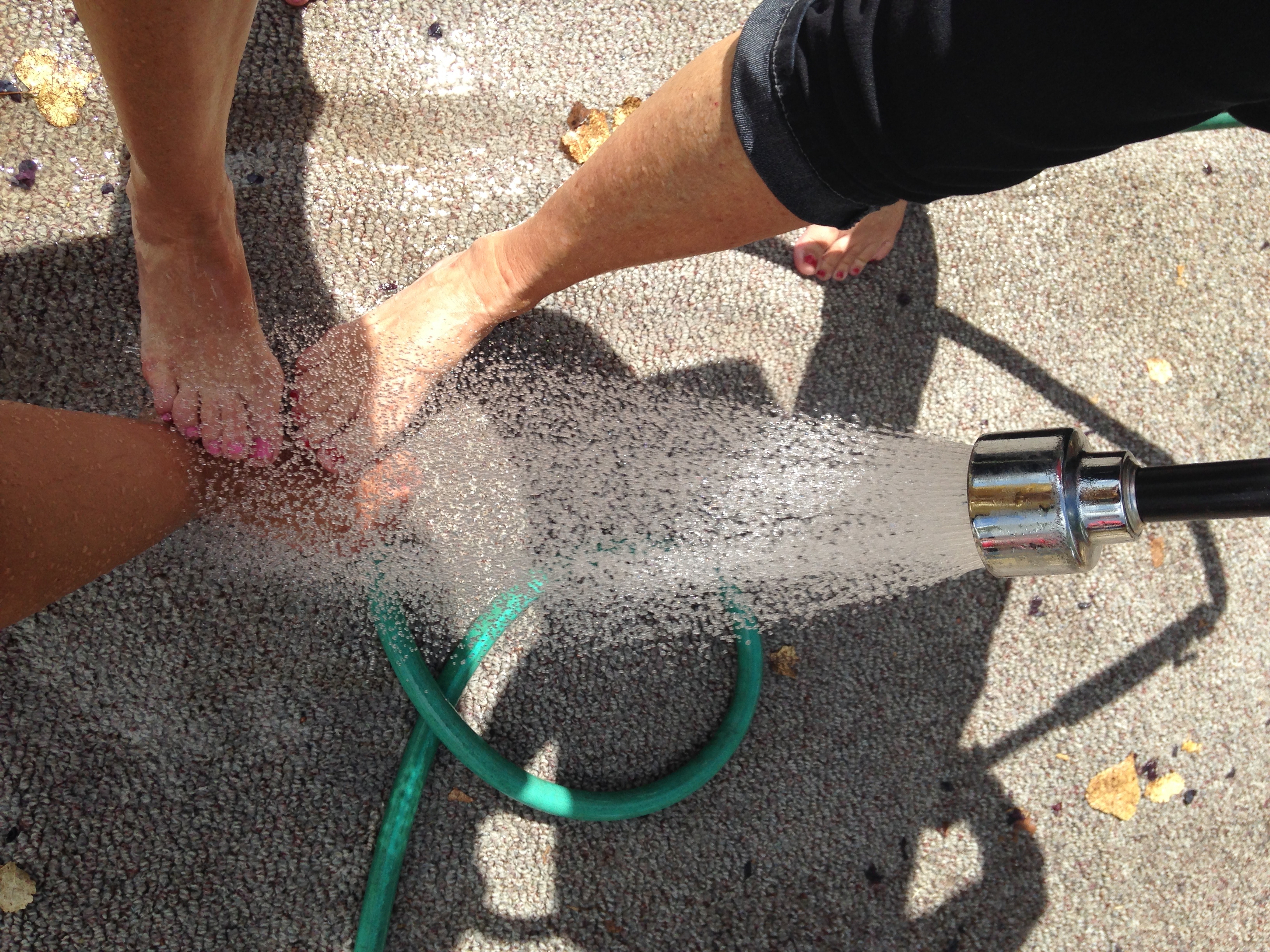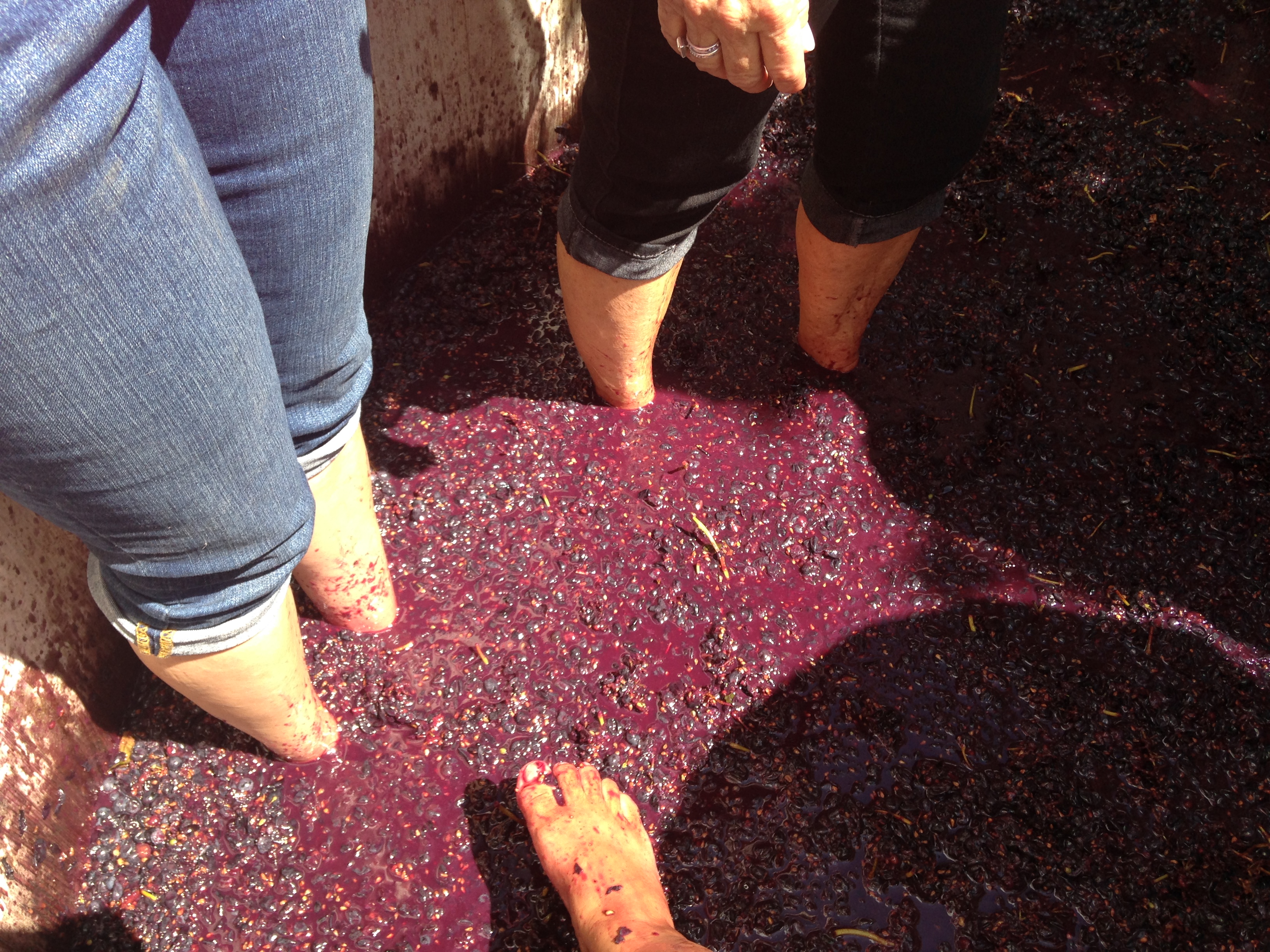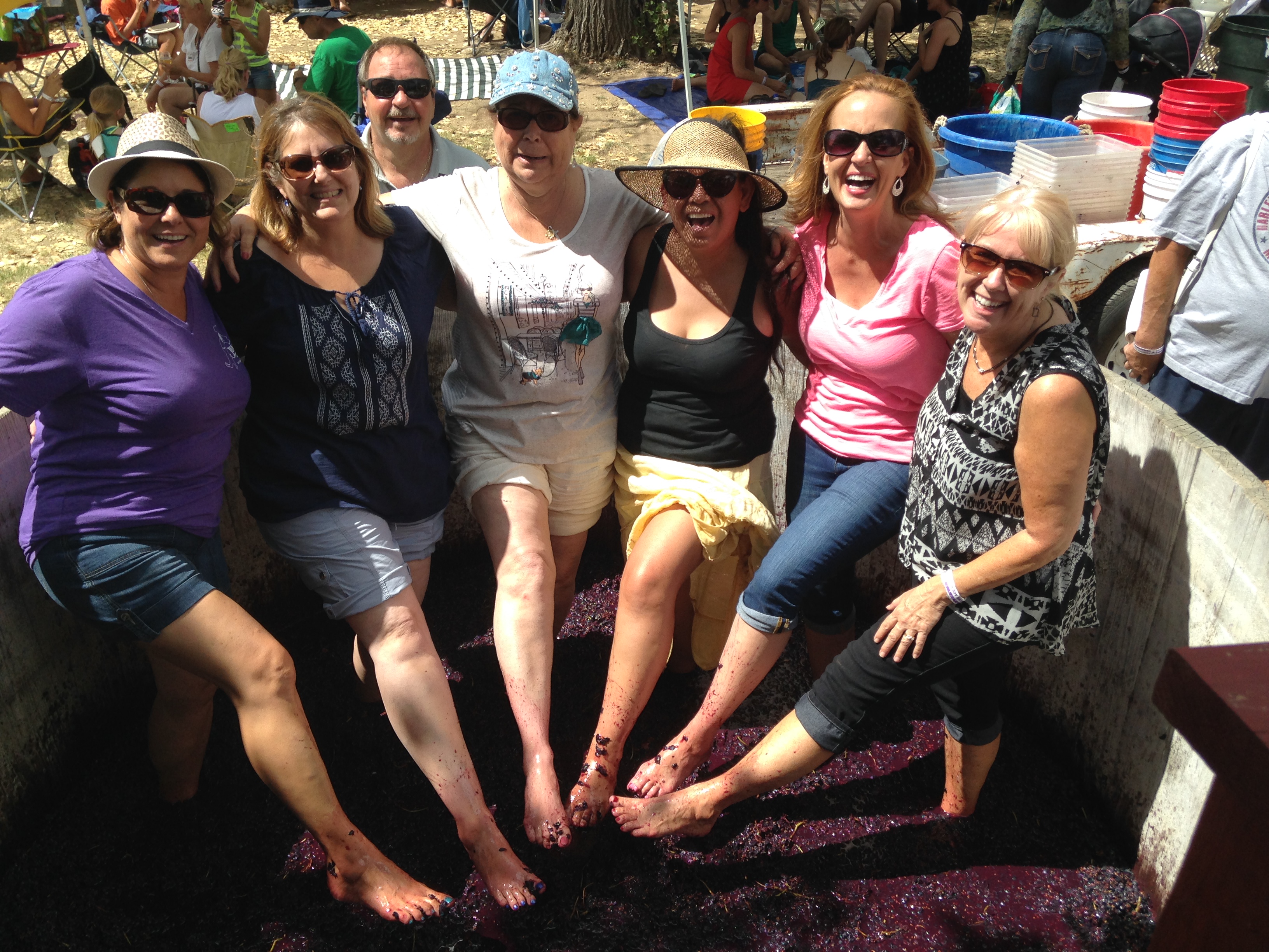 In we go…I slowly climb down the ladder as it seems slippery…I stick my right foot in, then my left…hmm, mushy feeling. Gigi and Lynn get in, we take a few pictures. Then Marie, Carmella and Sylvia get in, their husbands having walked over to watch. More photos. We stomp around, trying to look like we are actually crushing grapes. By the time we get in most of the whole bunches have been crushed, but we find a few in the bottom recesses of the large barrel using our toes. We stomp around a bit, and take more pictures. We want to take our sweet time, heck we waited so long in the first place, but we are also aware that many more are waiting for their turn. Basically, we want to make it worth our while.