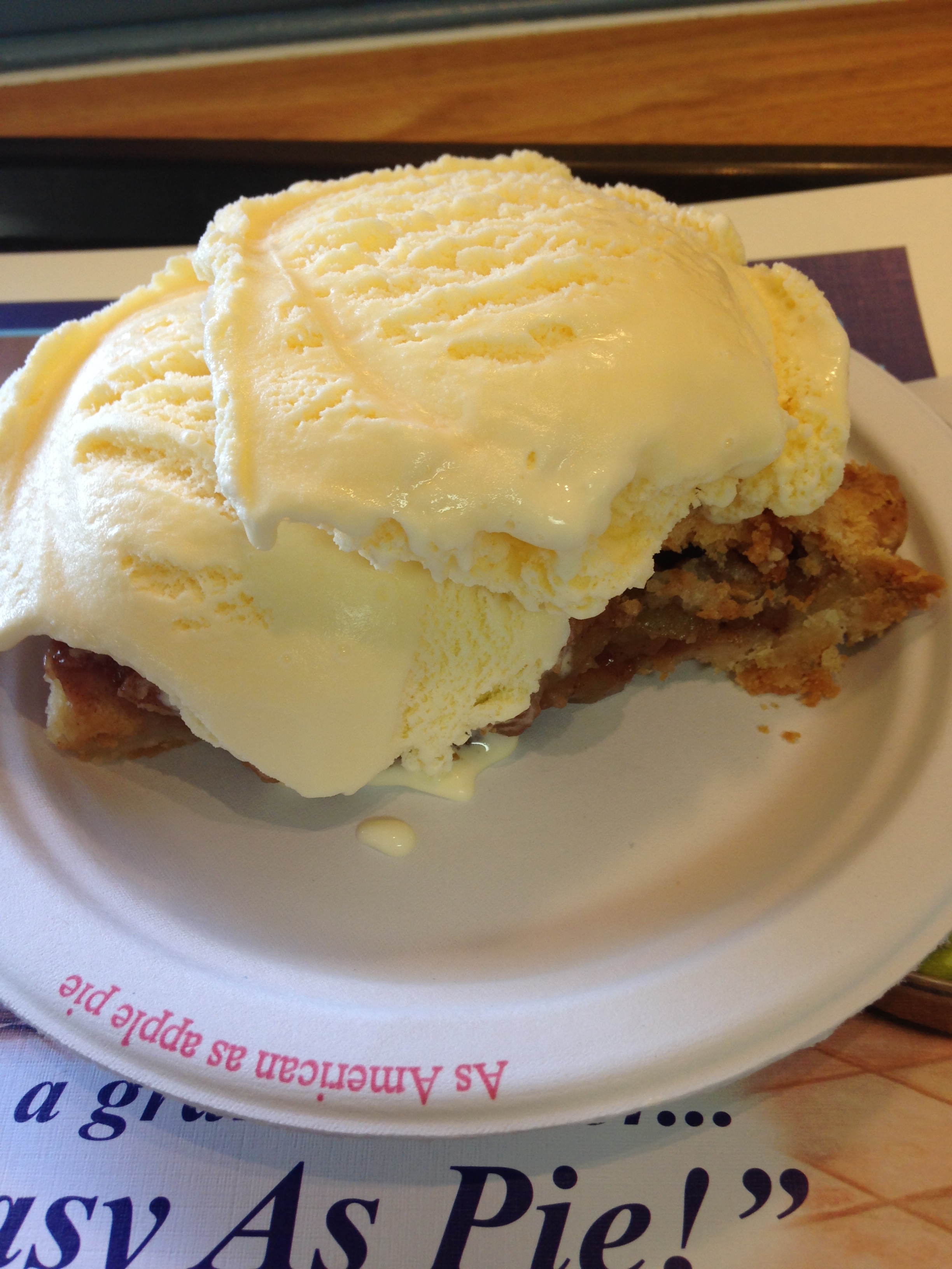 The ice cream line was too long, it was still hot, and we weren’t in the mood to shop the vendor booths. So now what? Time to head back down the hill for a stop at the Julian Pie Company in Santa Ysabel. Hey, what else would you expect from me? Of course, as we leave, the rain clouds start to mosey on over and cause a bit of trouble. We get to Santa Ysabel just in time to get out of the pouring rain, sit at the counter and comfortably scarf down apple pie slices with vanilla ice cream, pure deliciousness.