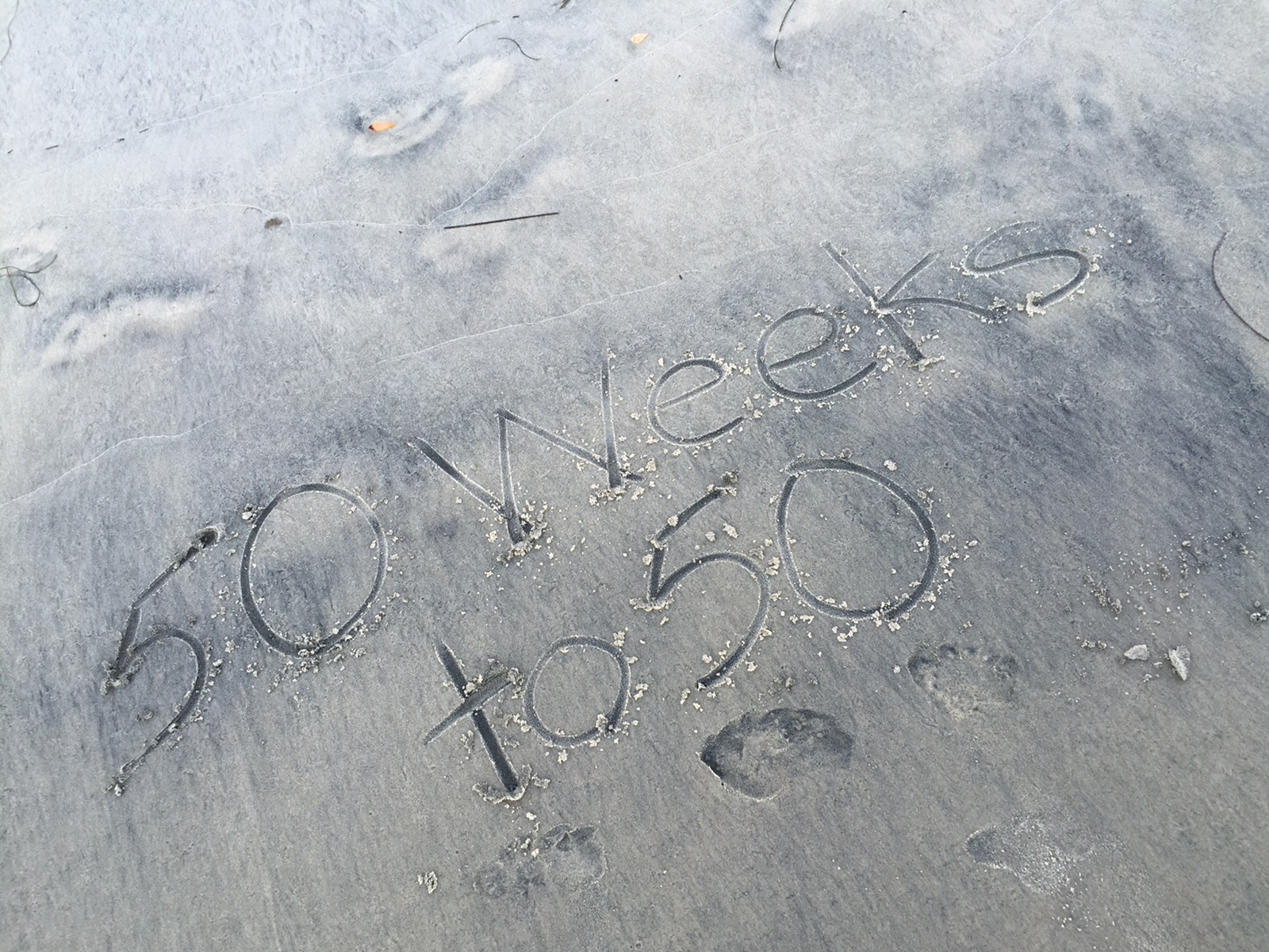 The jaunt down to Black’s Beach was supposed to be a quick experience to check off my list, but now that I’m here, free to the wind, who wants to leave? Not me! Party to prep for, ehh, so what if I haven’t shopped for food yet, everyone’s good with chips and dip right? I am not going to stress, not now, not at such a relaxing moment. Lacy and I take a dip in the water which really wasn’t that cold, and actually felt invigorating. We leisurely walk around, take pictures (later I will regret sitting butt naked directly on the sand). I write in the sand “50 Weeks to 50” and soon thereafter a wave washes it away. No evidence.