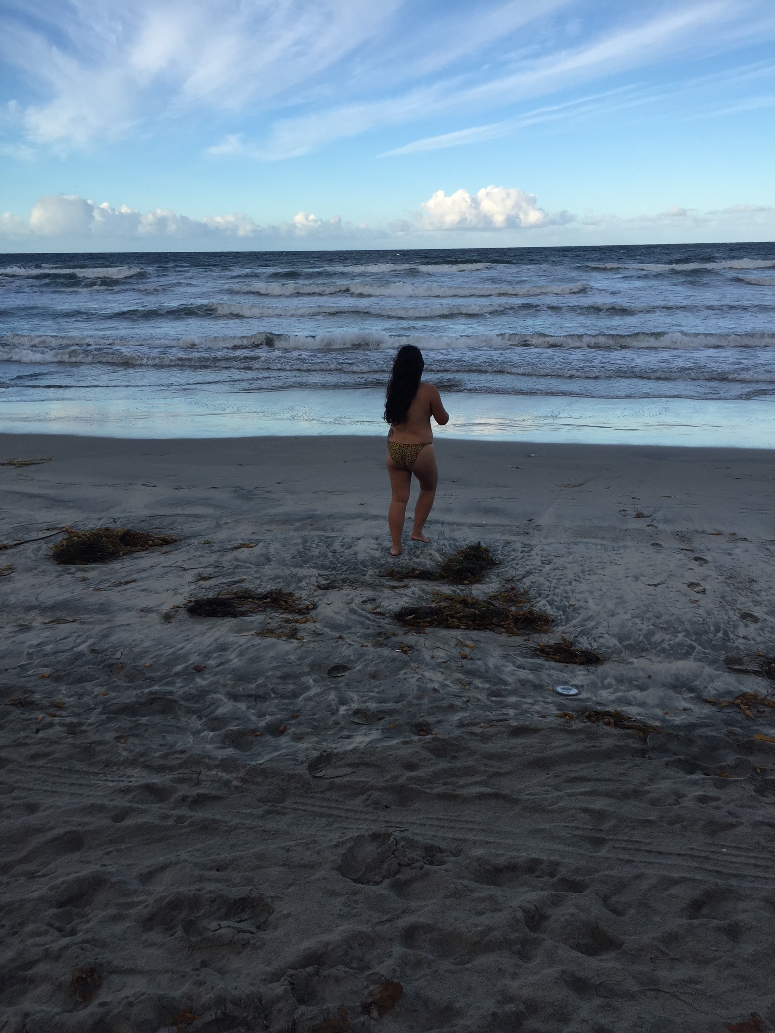 Okay, I guess it’s now or never. I carefully take off my sweats and place them neatly folded on my towel. I rarely wear a bikini, but this morning I did, so I hesitantly take off my top and plop it atop my daypack. Not so bad. I slowly start walking towards the shore. Lacy is already naked and in the water…I look around again, still no one in sight…quickly now, bottoms off, thrown haphazardly behind me, and I run into the ocean. Ahh, what a discovery!