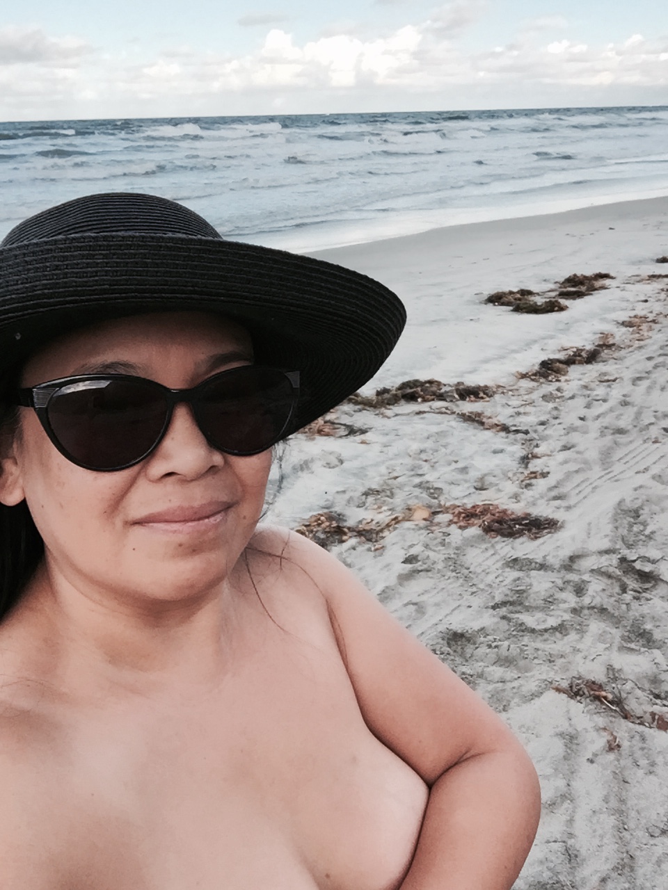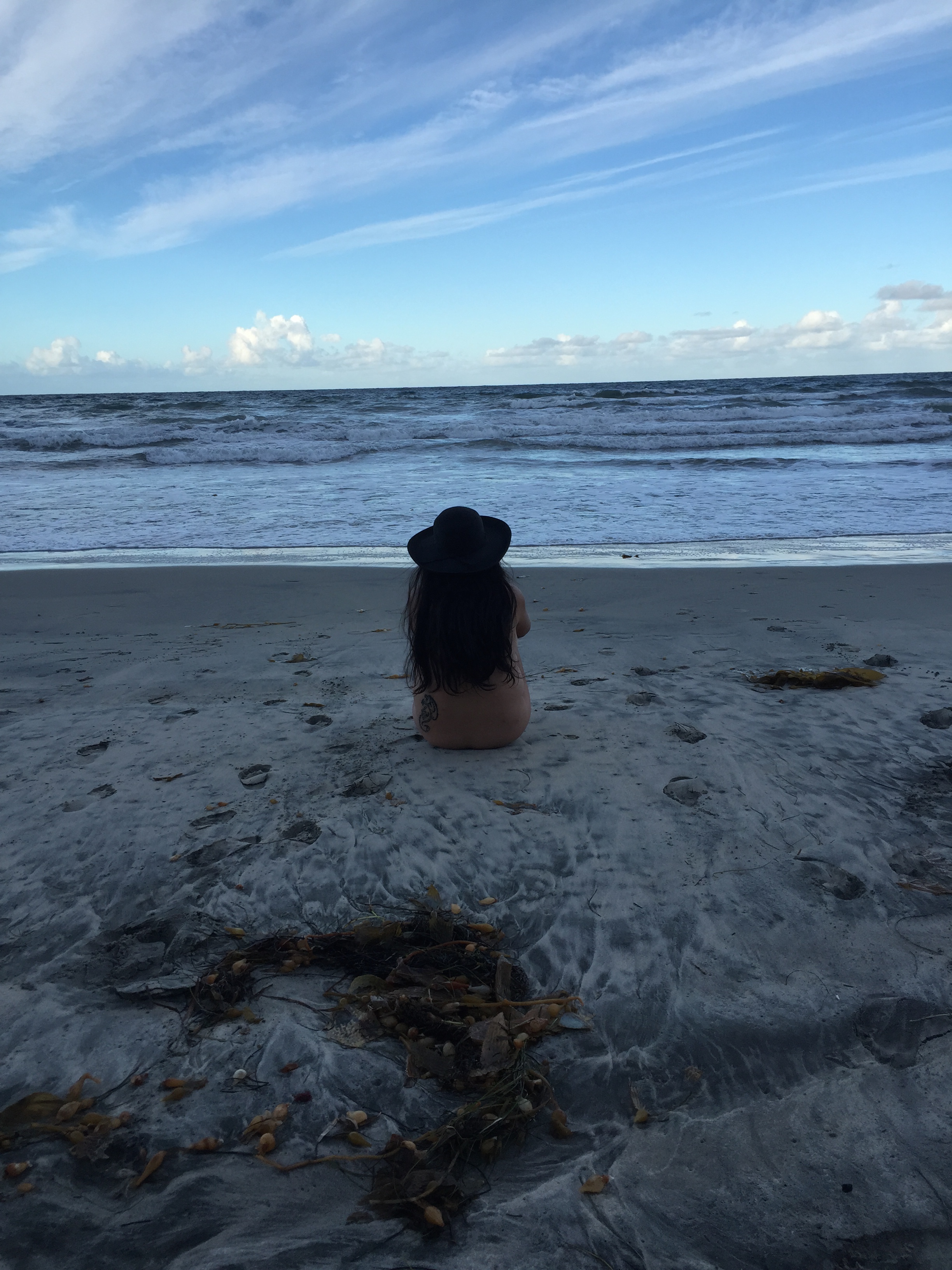 The quiet, deserted beach is the backdrop to my birthday suit runway. My collection mirrors that of The Emperor’s New Clothes fall line. Exposed to the ocean air, my new fashion is quite exhilarating, as if a newly discovered pattern. I was born naked, why not celebrate my birthday by going back to the beginning…because in some ways, turning 50 has been a new start.